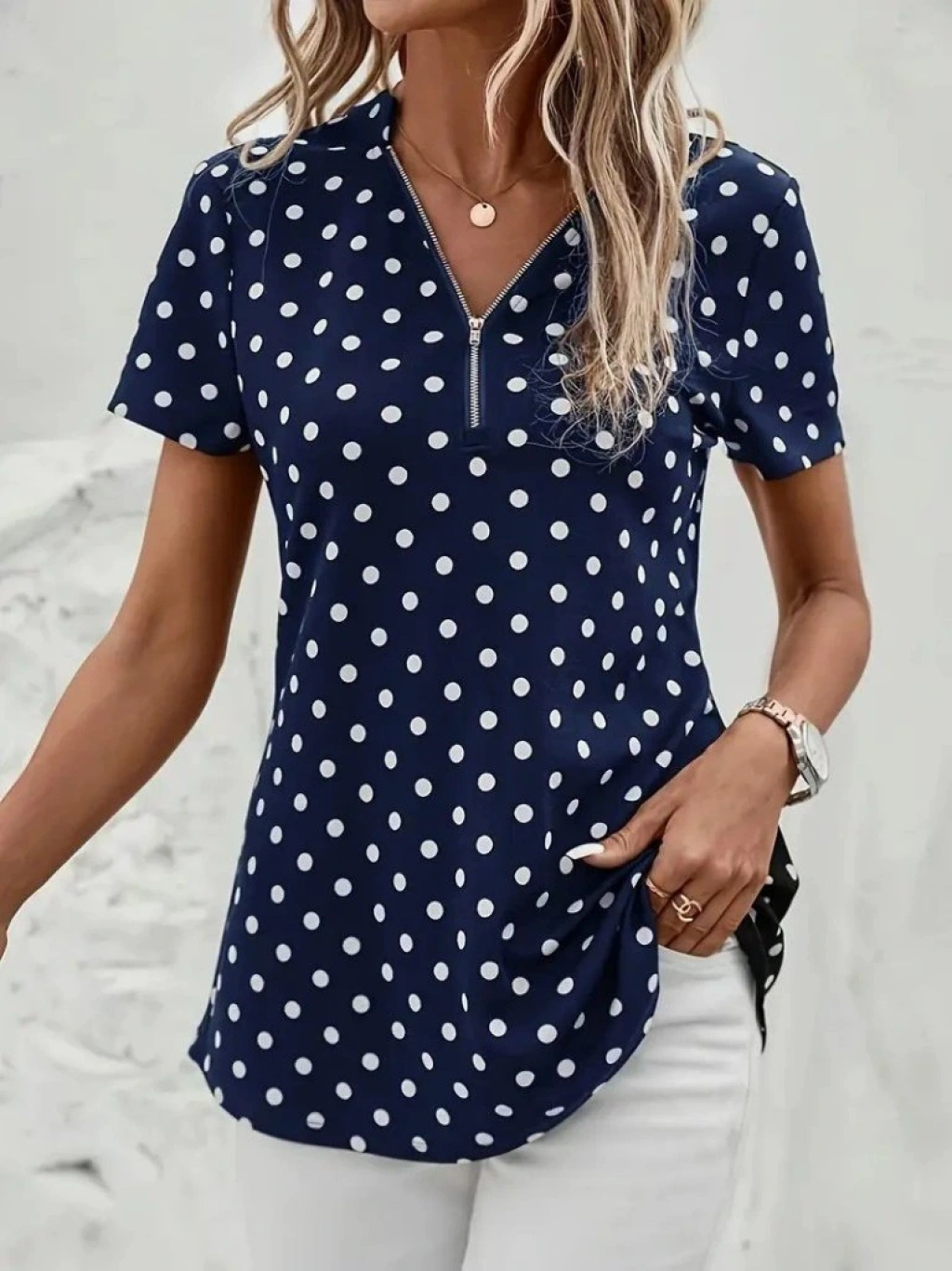 Kadın Kısa Kollu Yakadan Fermuarlı Puantiyeli Uzun Dokuma Viskon Bluz