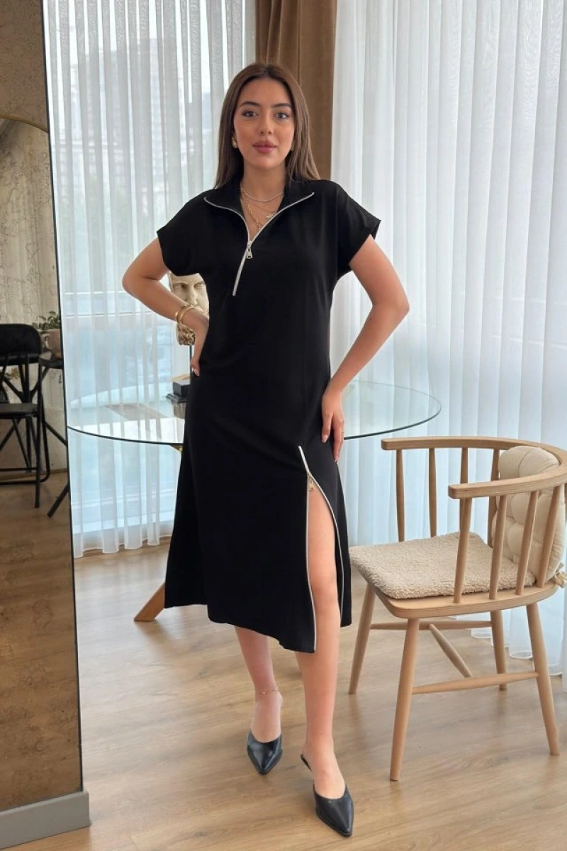 Kadın Kısa Kollu Yakadan Ve Etekten Fermuarlı Midi Viskon Iki Iplik Elbise
