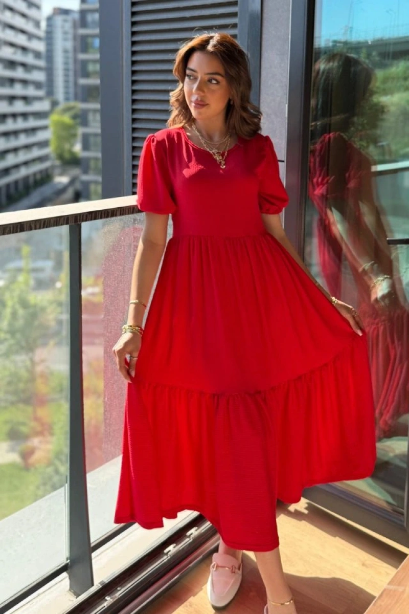 Kadın Kısa Kollu Yakası Açık Katlı Bürümcük Balon Elbise