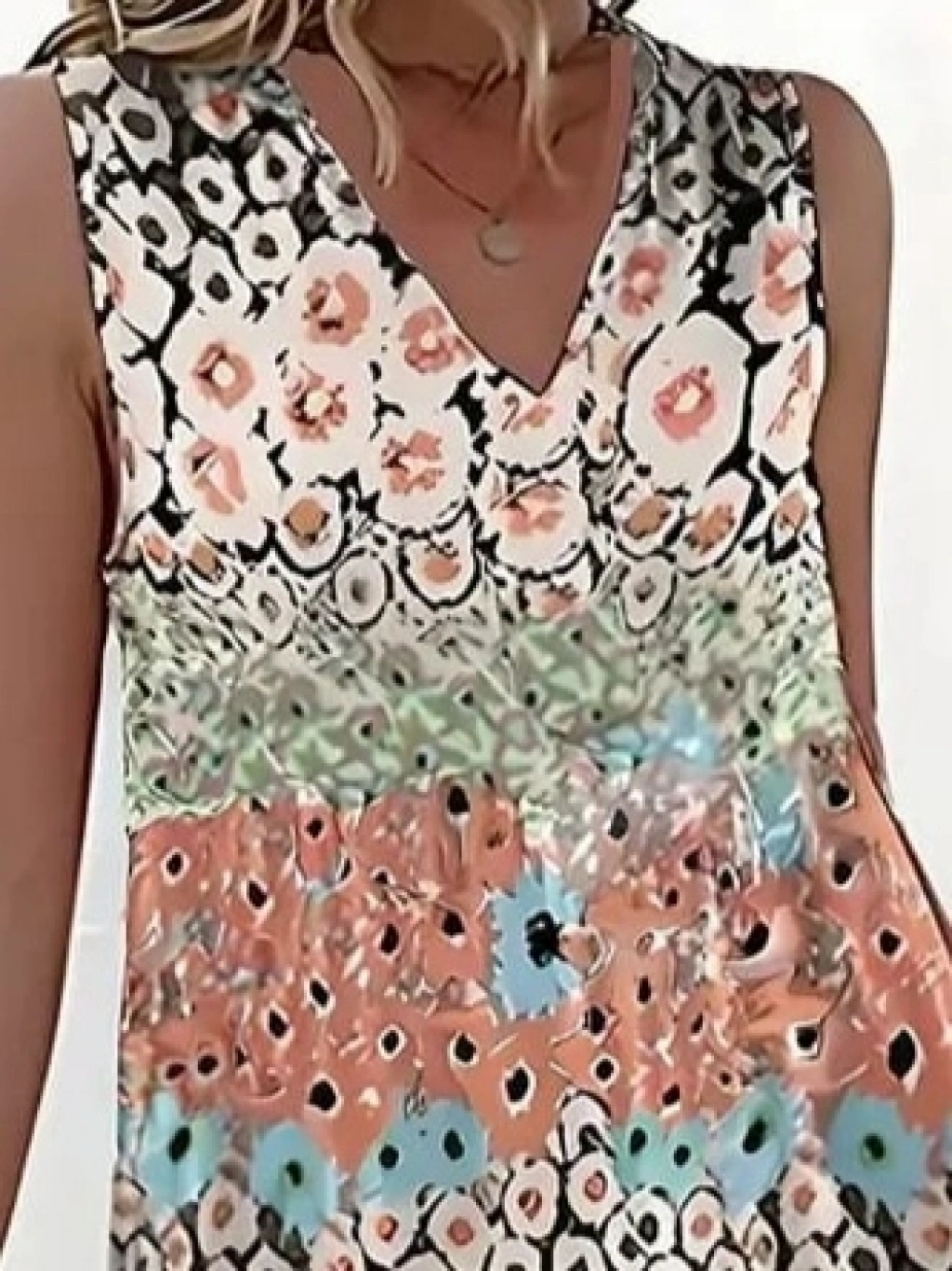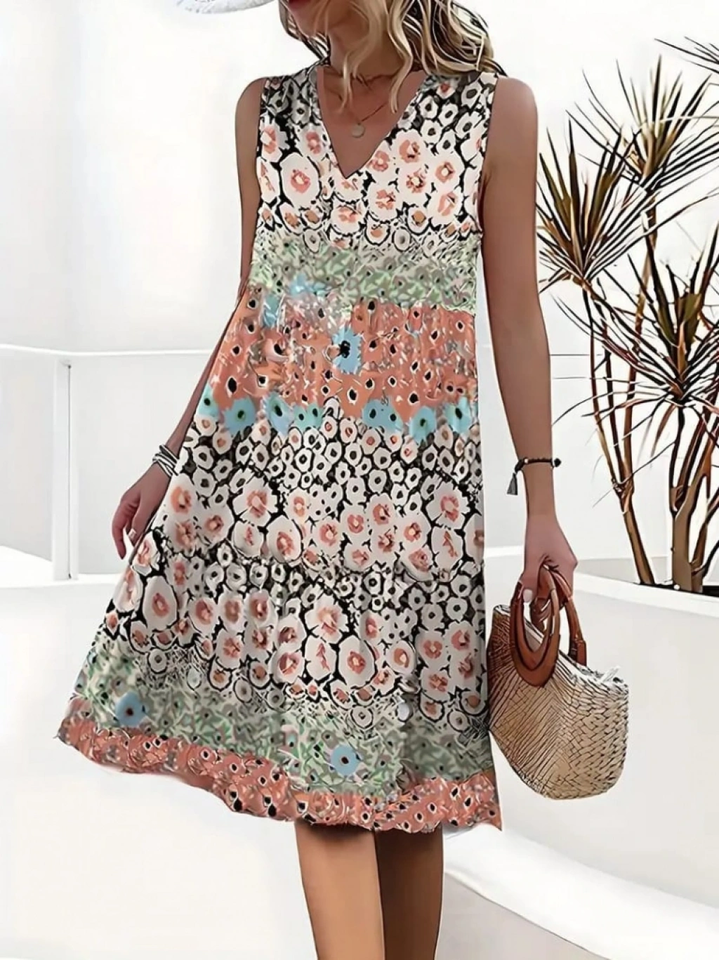 Kadın Kolsuz V Yaka çiçek Desenli Süprem Elbise
