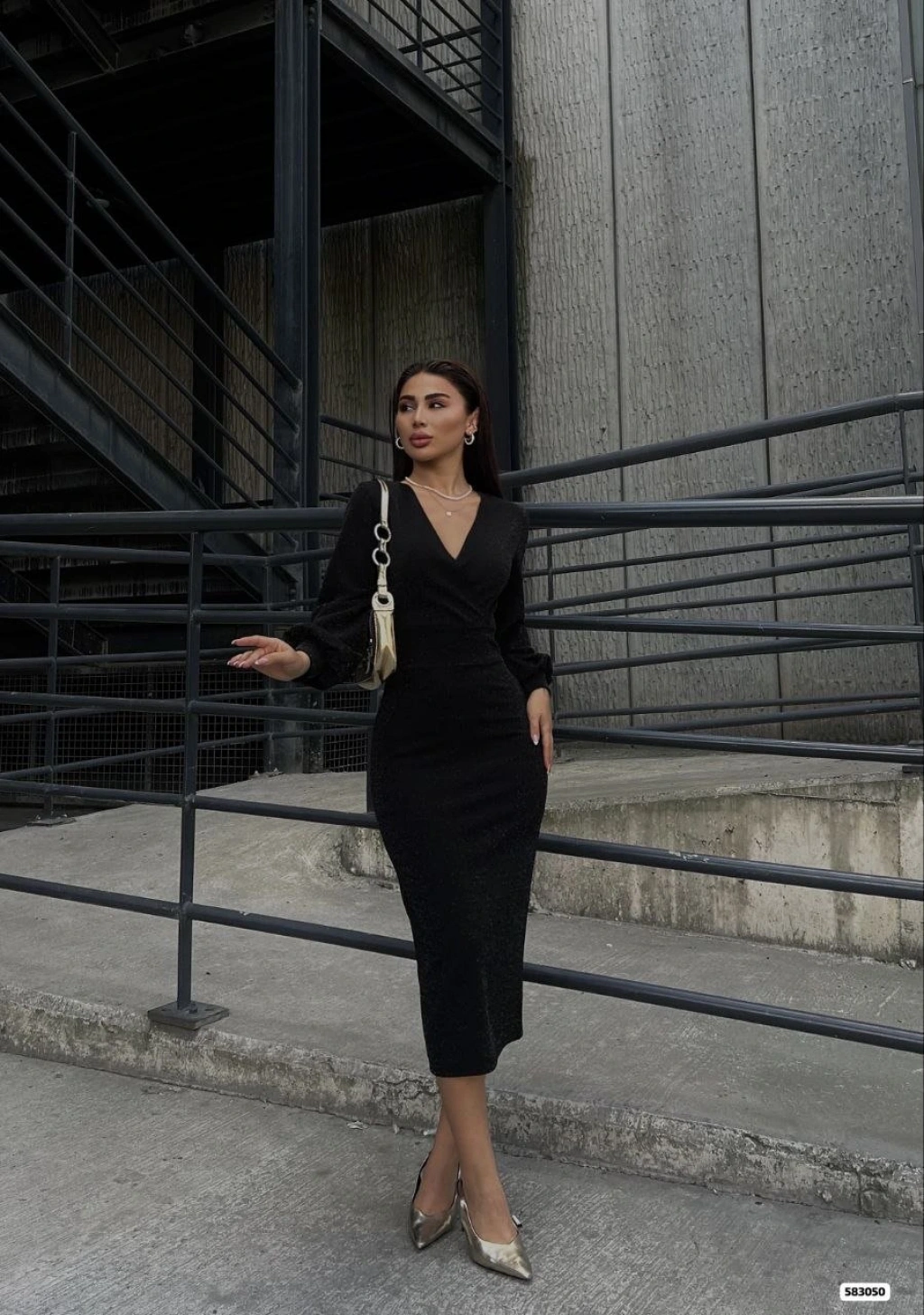 Kadın Kruvaze Yaka Balon Kol Simli Krep Kumaş Midi Boy Elbise