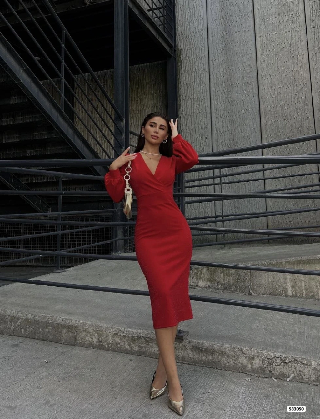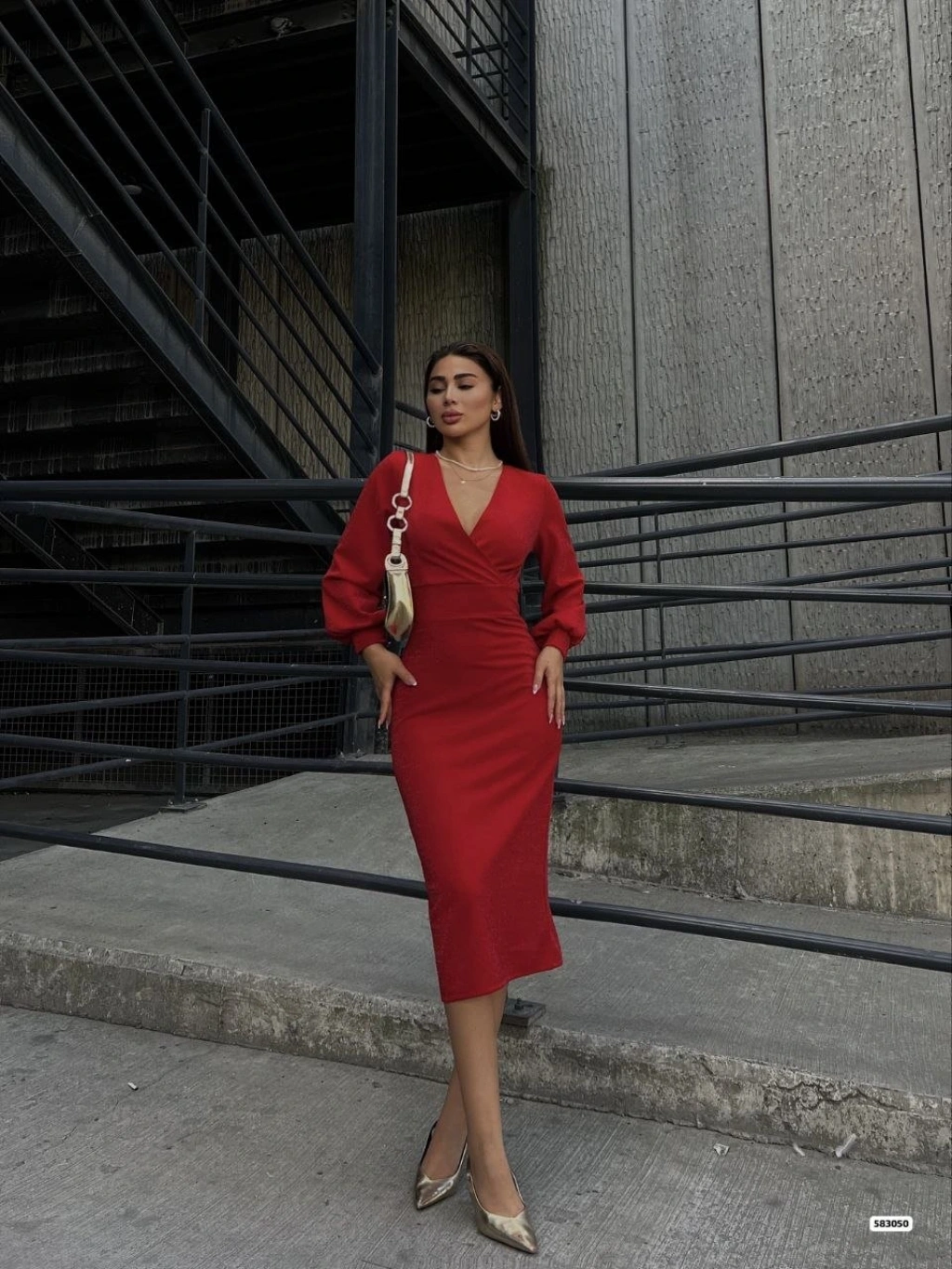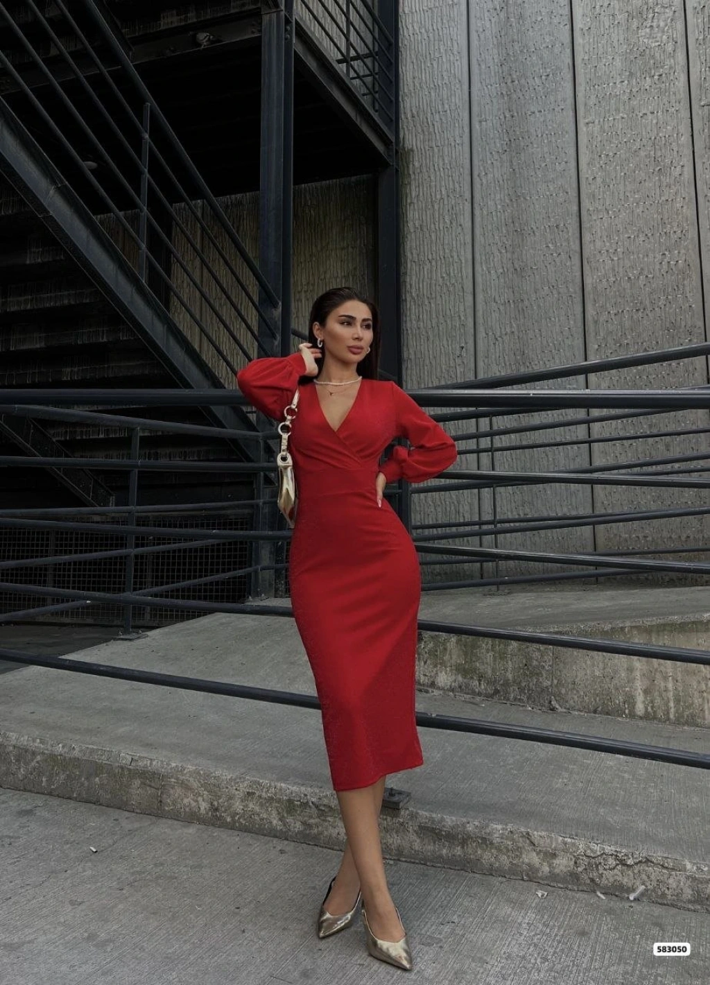 Kadın Kruvaze Yaka Balon Kol Simli Krep Kumaş Midi Boy Elbise