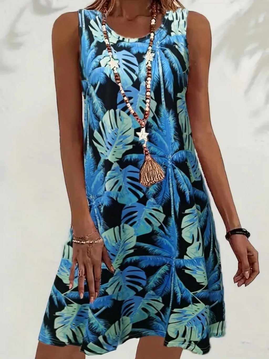 Kadın Mavi Yaprak Baskılı Askılı Süprem Elbise