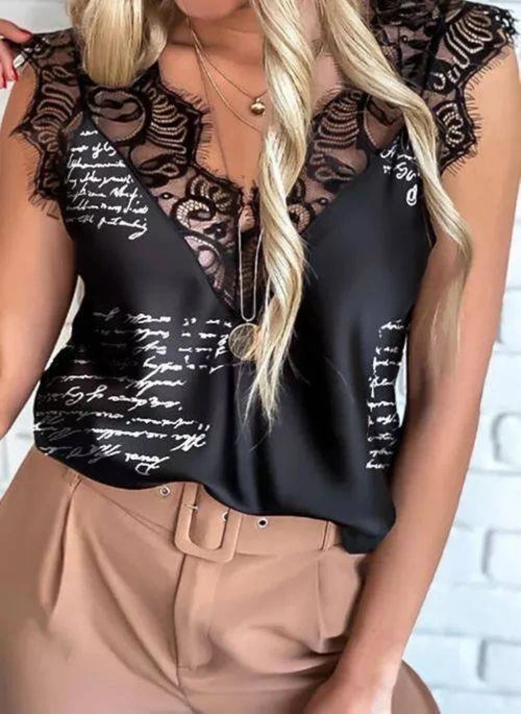 Kadın Mektup Desenli Dantel Detaylı Mikro Kumaş Bluz