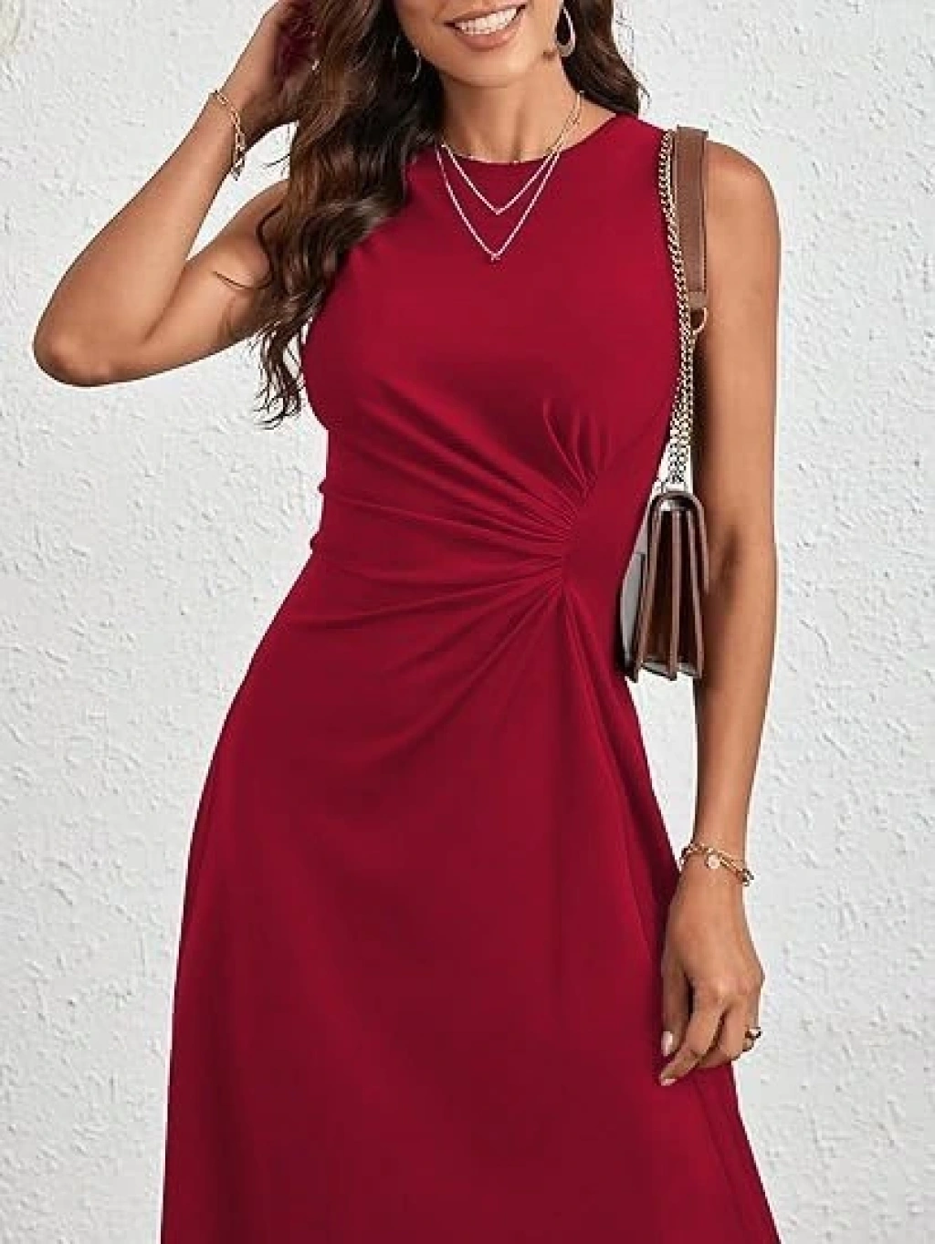 Kadın Sıfır Kollu Bisiklet Yaka Büzgülü Asimetrik Kesim Detaylı Janjan Krep Elbise