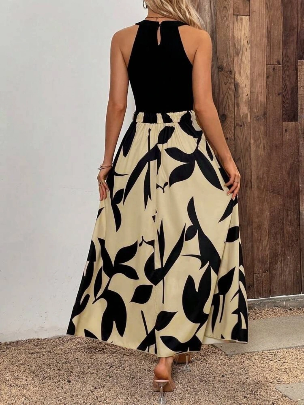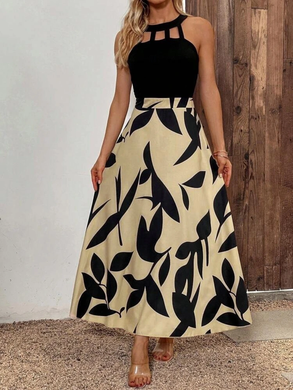 Kadın Sıfır Kollu Yakadan şeritli Omuzlardan Açık Janjan Krep Desenli Al Dalgıç Maxi Elbise