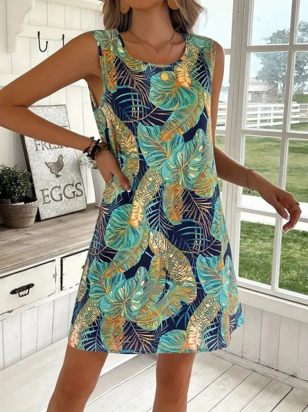 Kadın Sıfır Kollu Yuvarlak Yaka Desenli Süprem Elbise