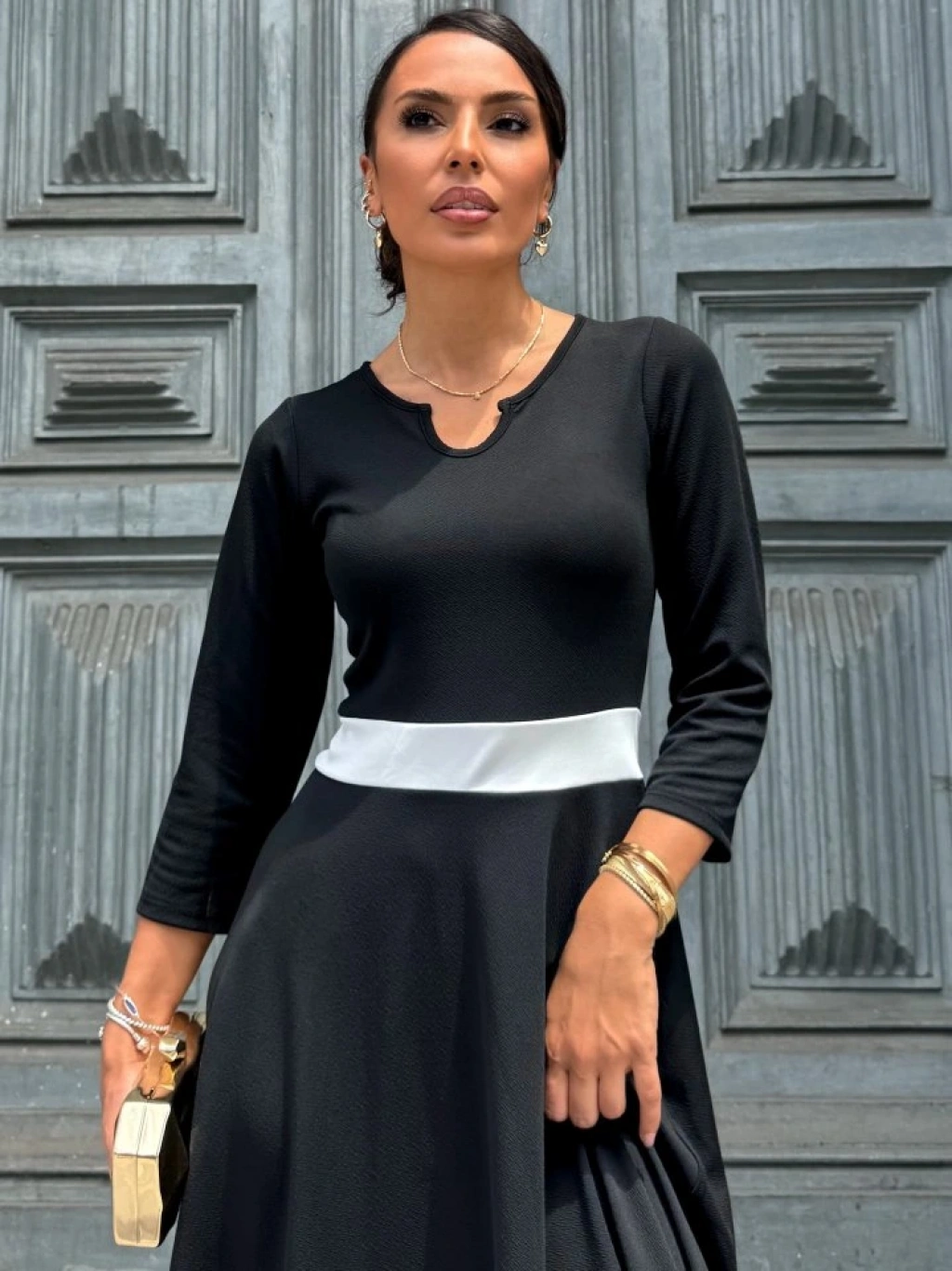 Kadın Truvakarkol Yakası Açık Blok Renkli Krep Midi Elbise