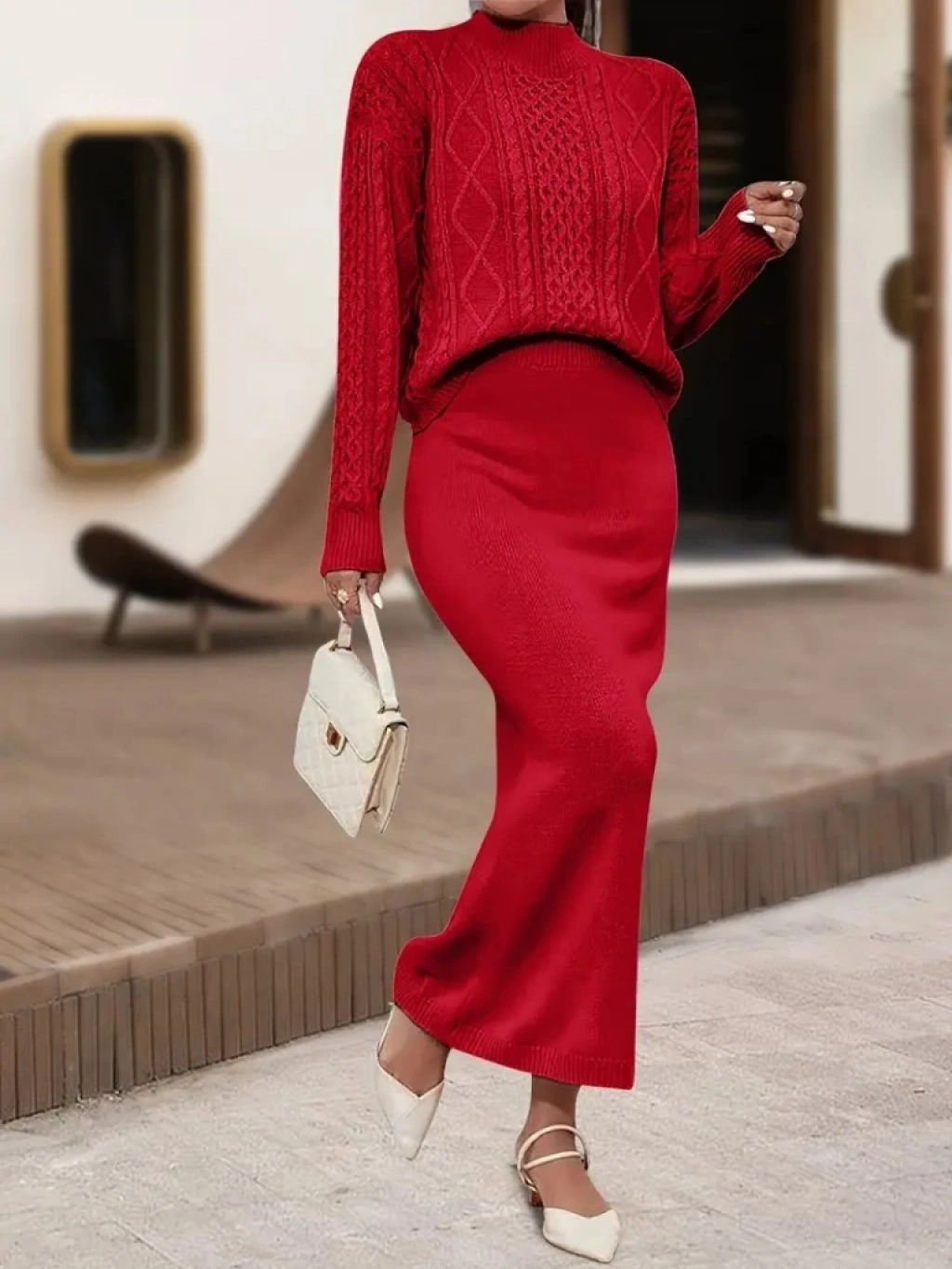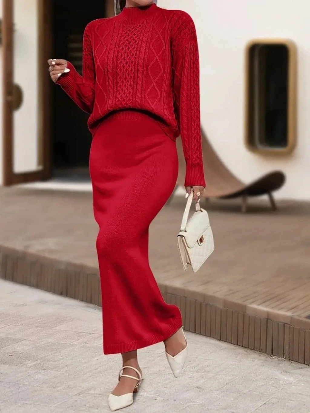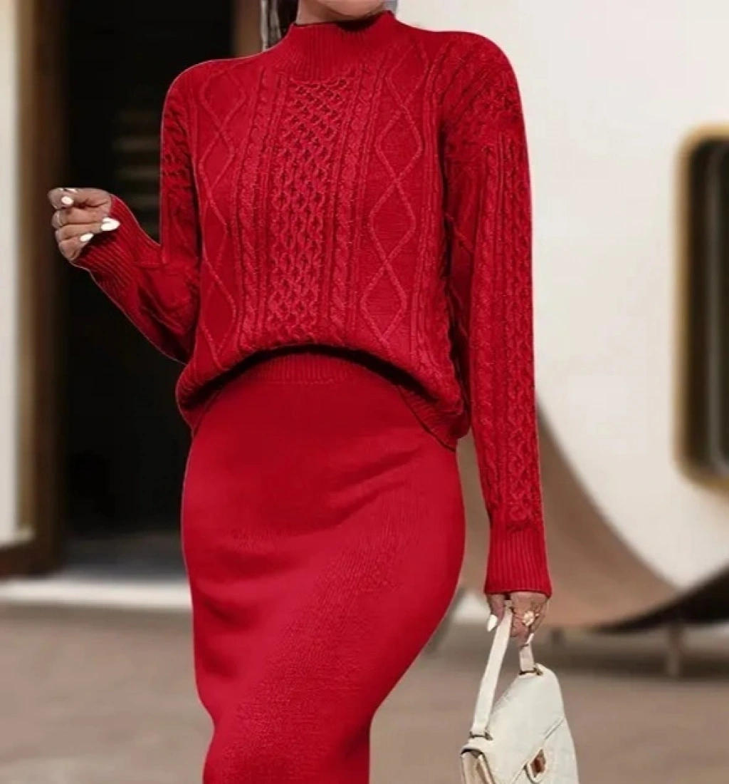 Kadın Uzun Kollu Balıkçı Yaka Bluz Ve Etek Ikili Triko Takım
