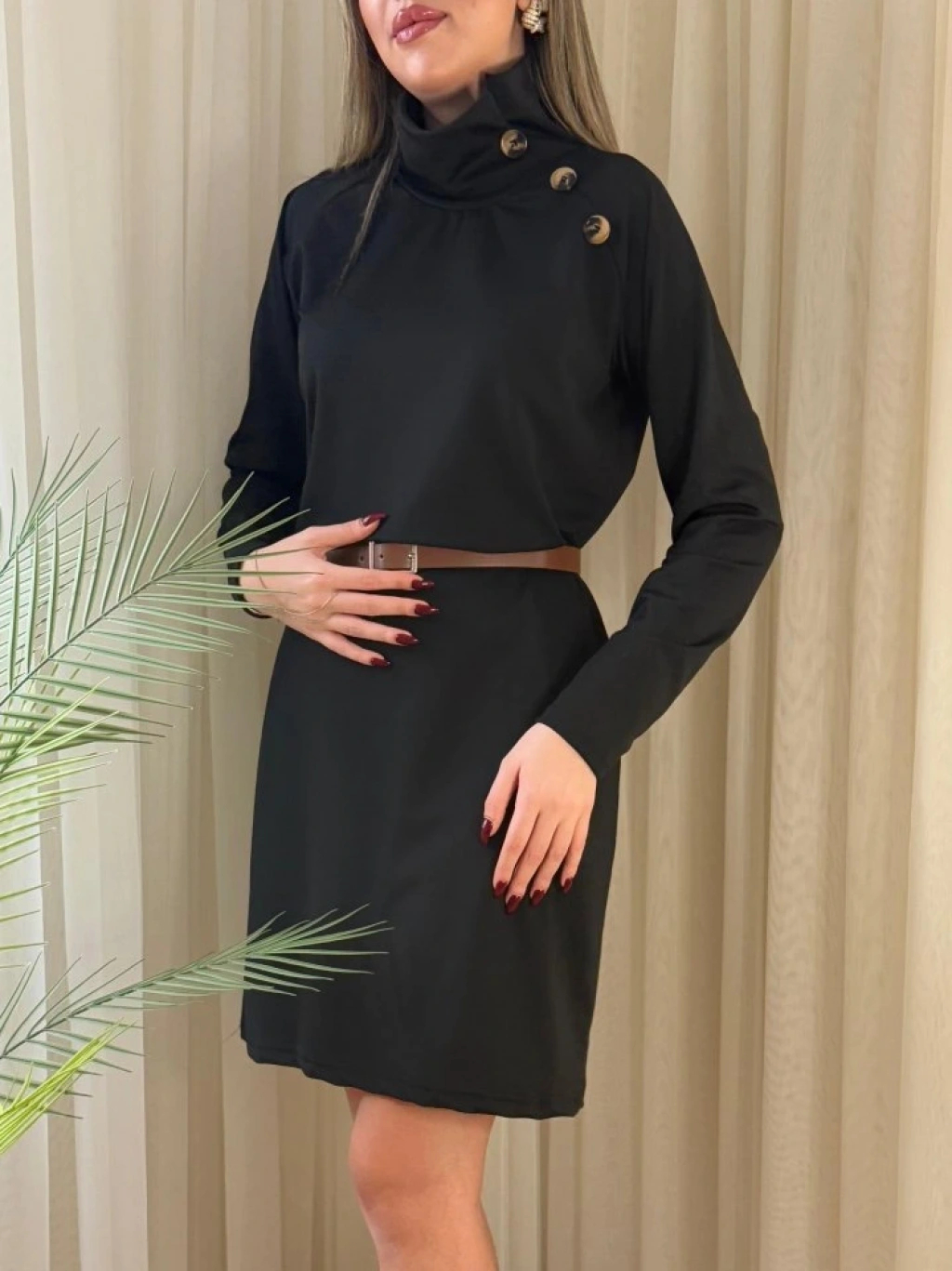 Kadın Uzun Kollu Balıkçı Yaka Düğme Detaylı Kısa şardonlu Dalgıç Elbise