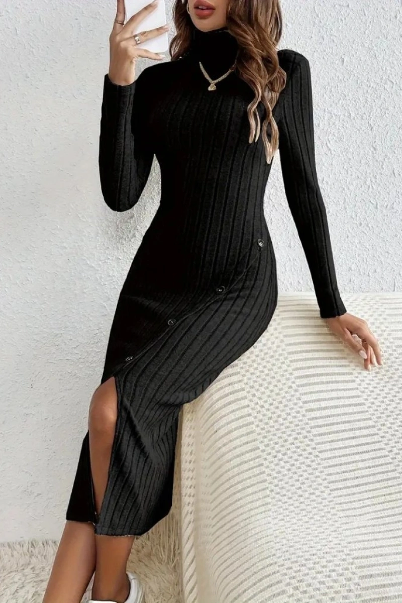 Kadın Uzun Kollu Balıkçı Yaka Yırtmaçlı Düğmeli şardonlu Kaşkorse Elbise
