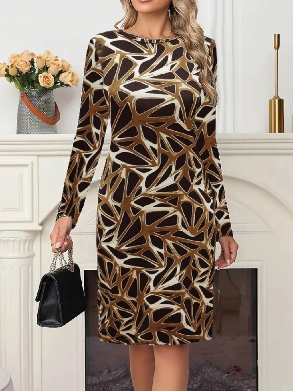 Kadın Uzun Kollu Bisiklet Yaka Desenli Dalgıç Kısa Elbise