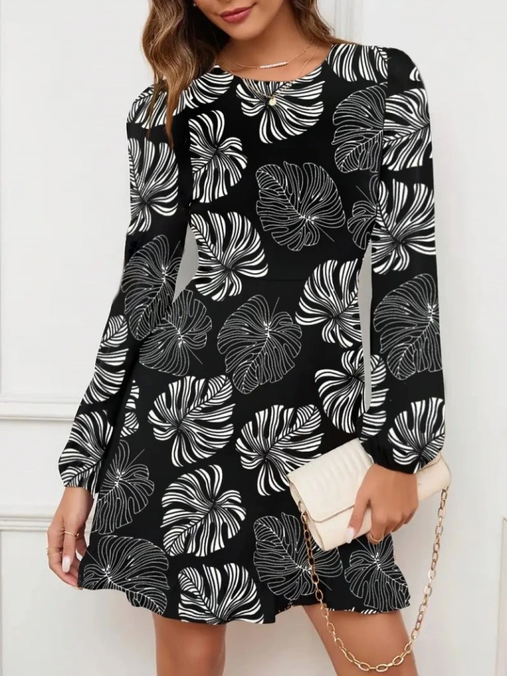 Kadın Uzun Kollu Bisiklet Yaka Desenli Kısa Krep Elbise