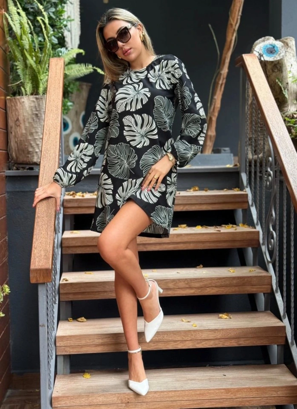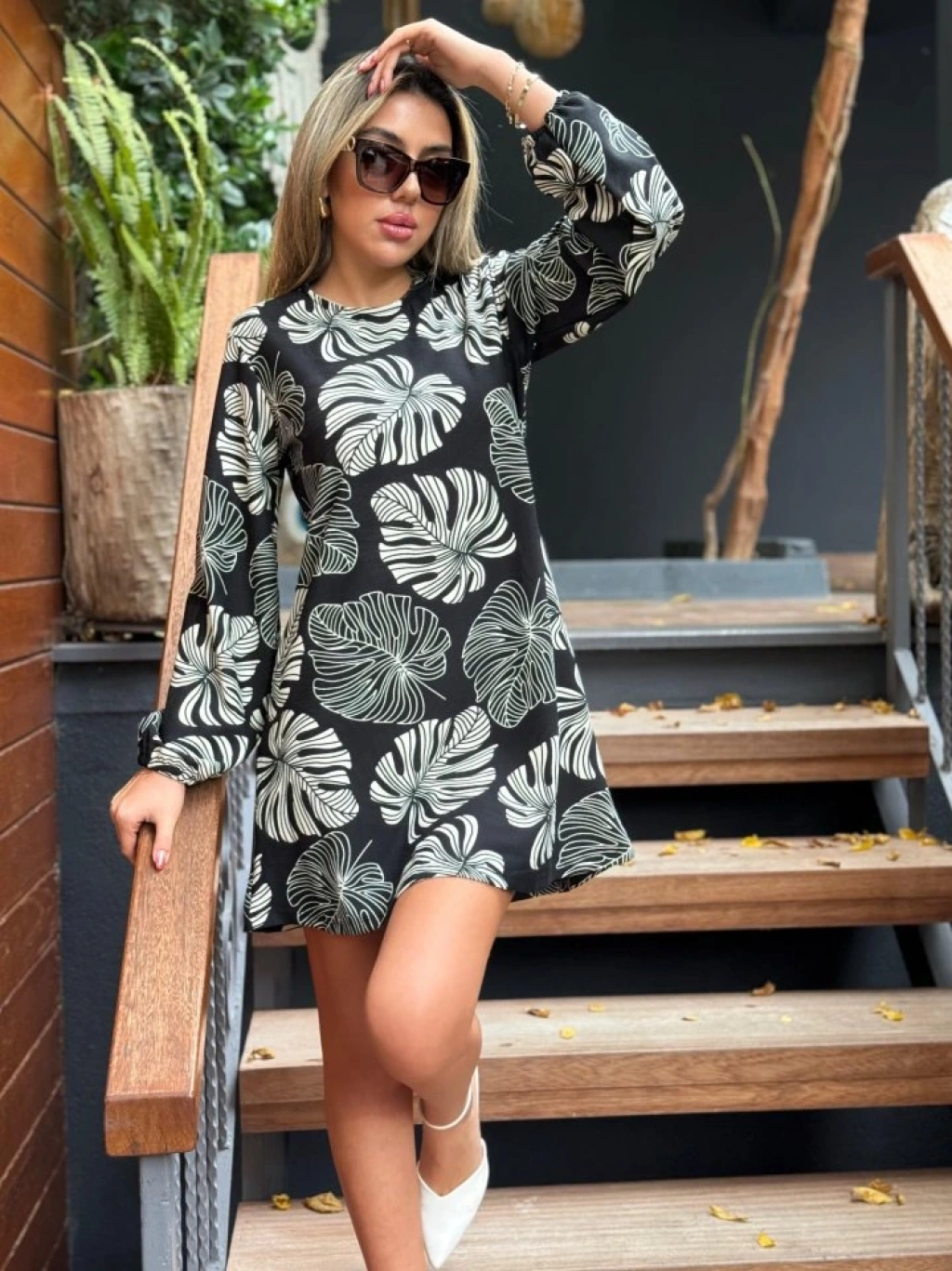 Kadın Uzun Kollu Bisiklet Yaka Desenli Kısa Krep Elbise