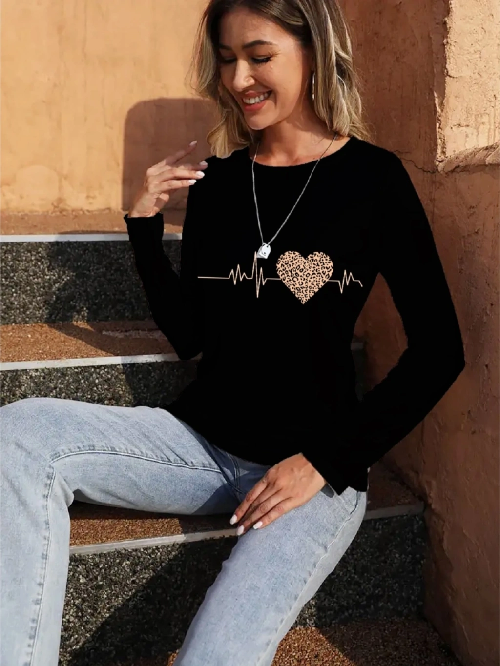 Kadın Uzun Kollu Bisiklet Yaka Kalp Desenli Bluz