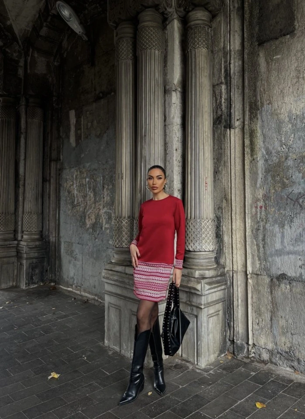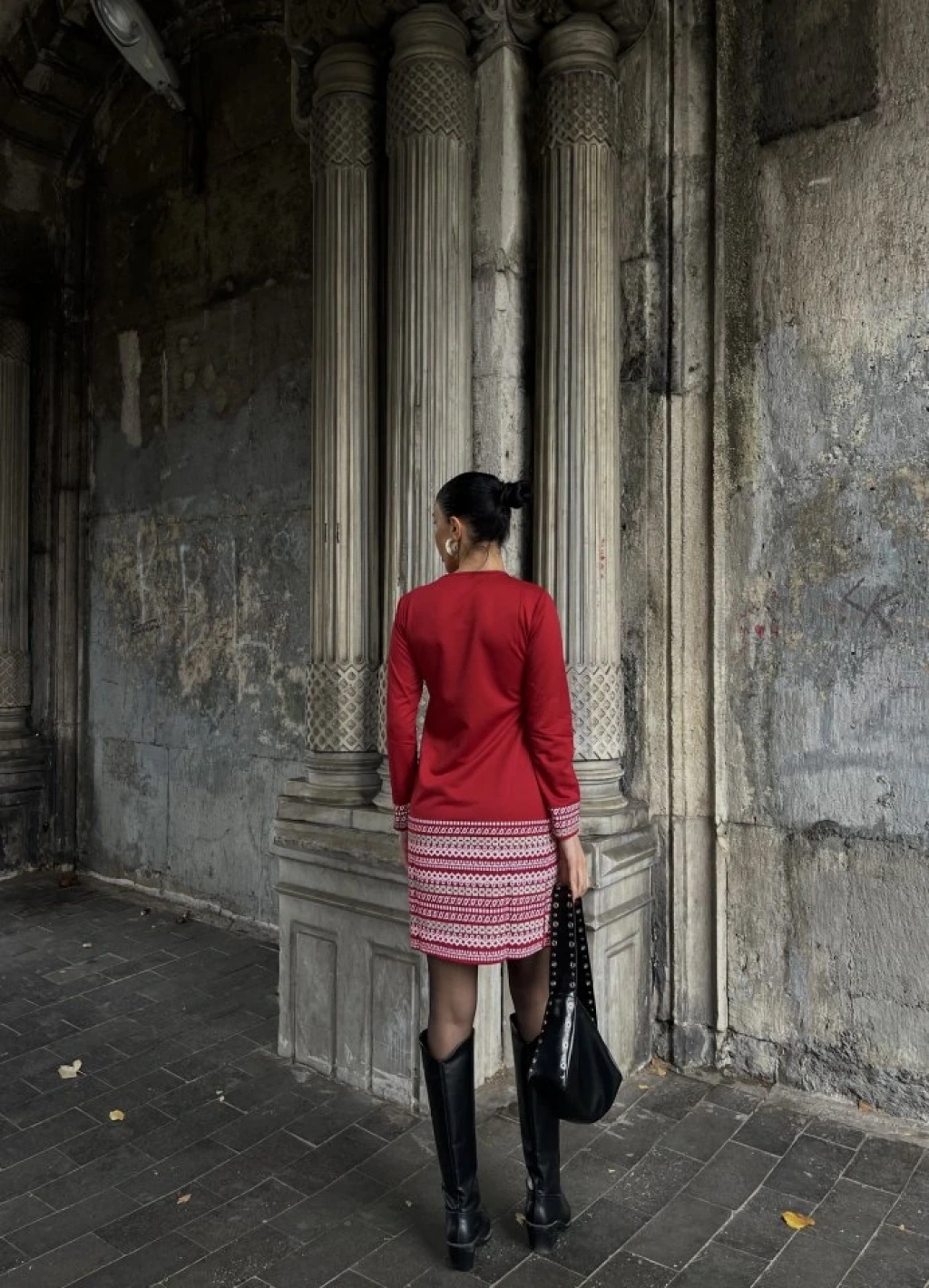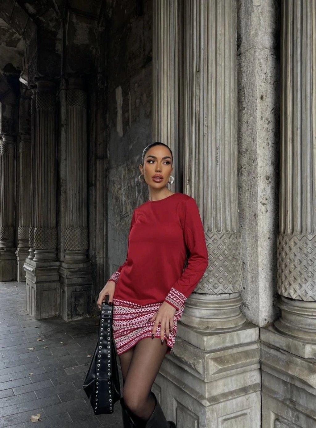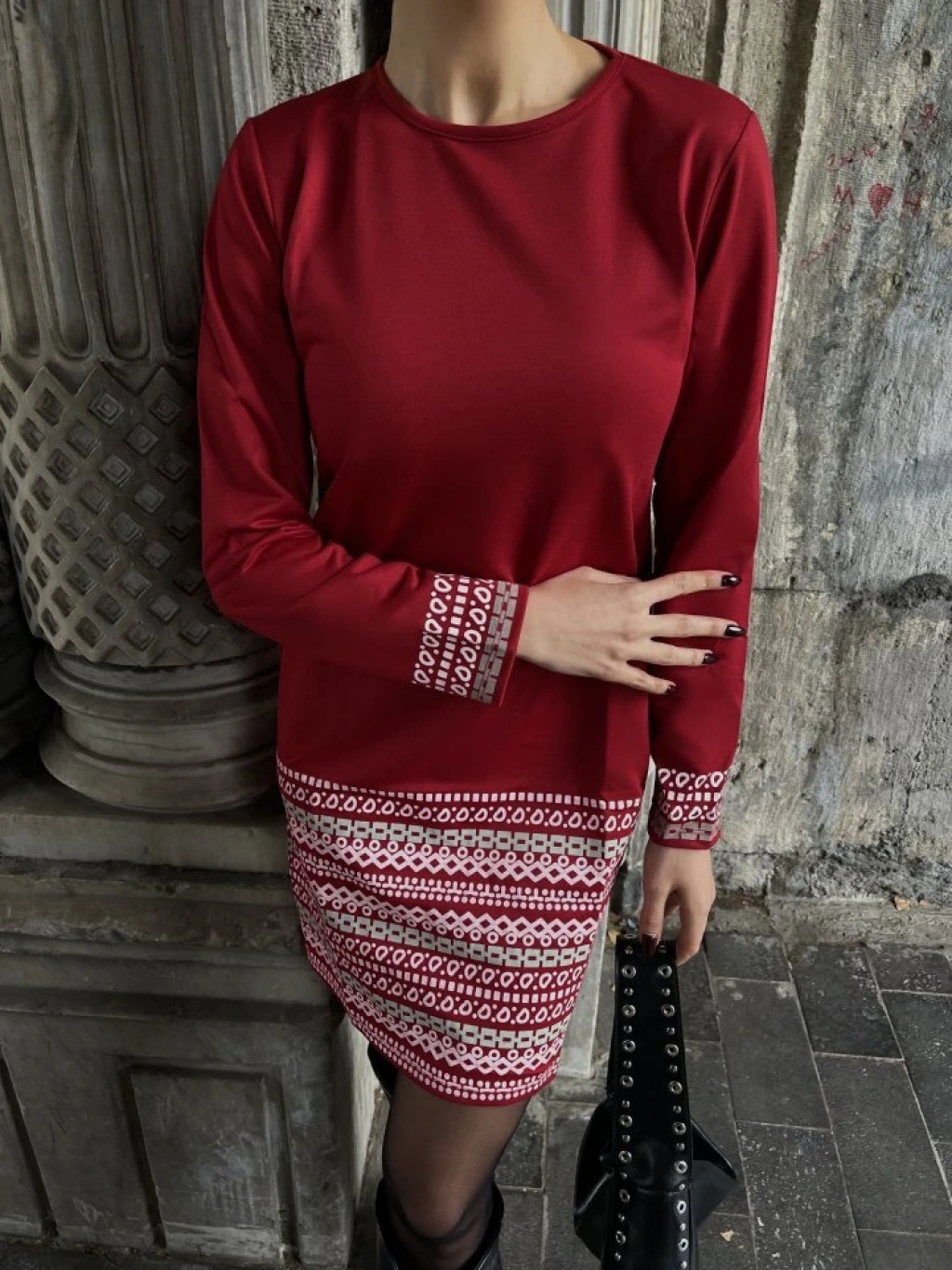 Kadın Uzun Kollu Bisiklet Yaka Kol Ağzı Ve Etek Ucu Baskılı Iki Iplik Elbise