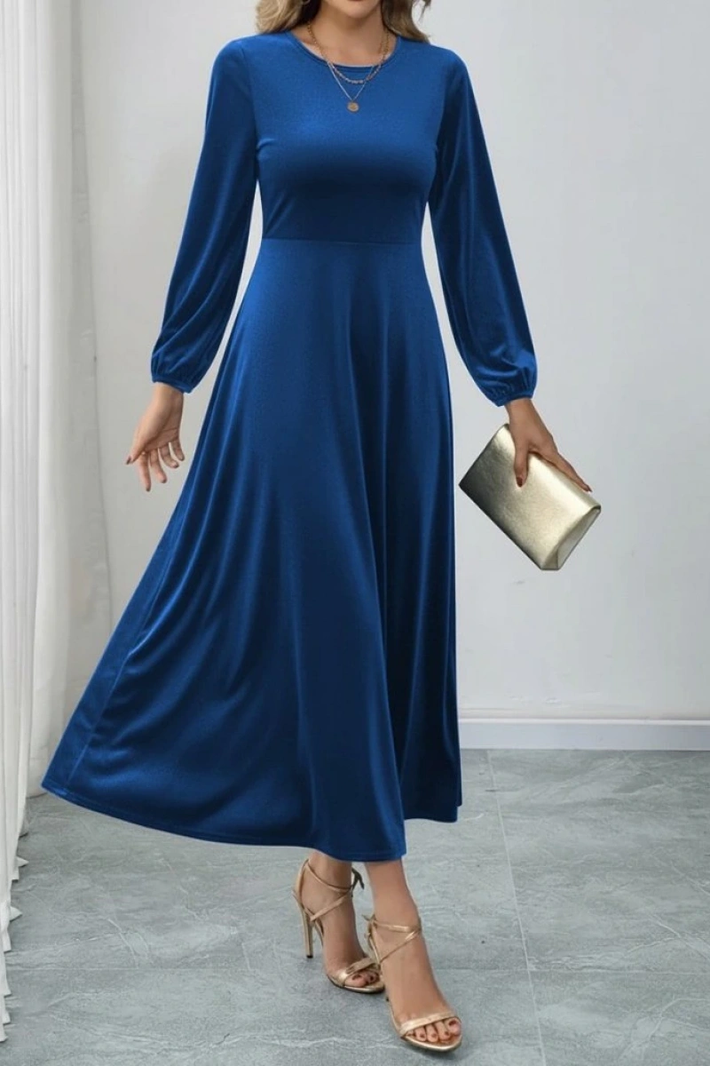 Kadın Uzun Kollu Bisiklet Yaka Midi Kadife Mavi Elbise