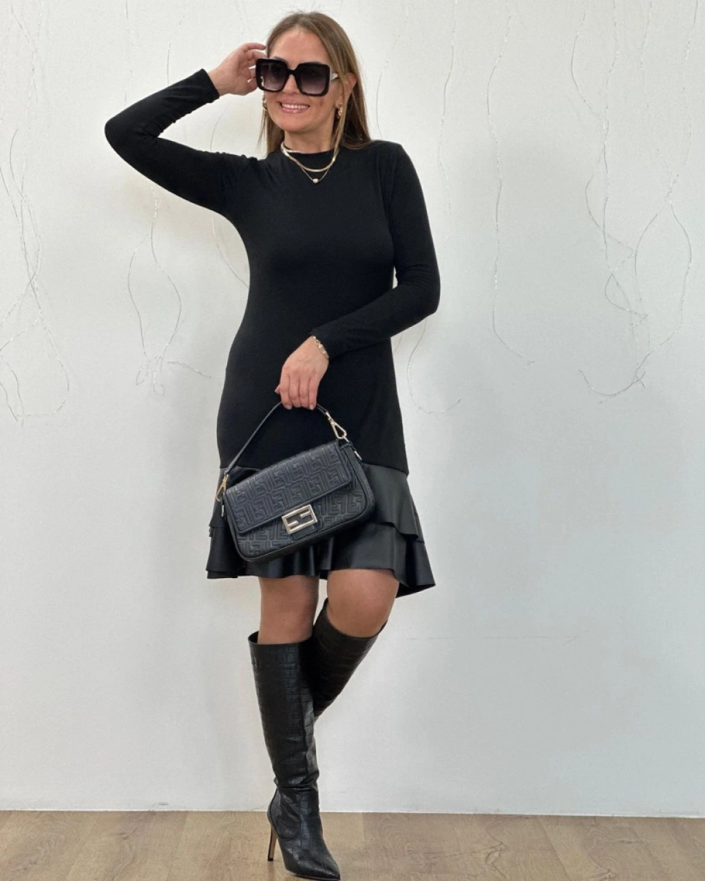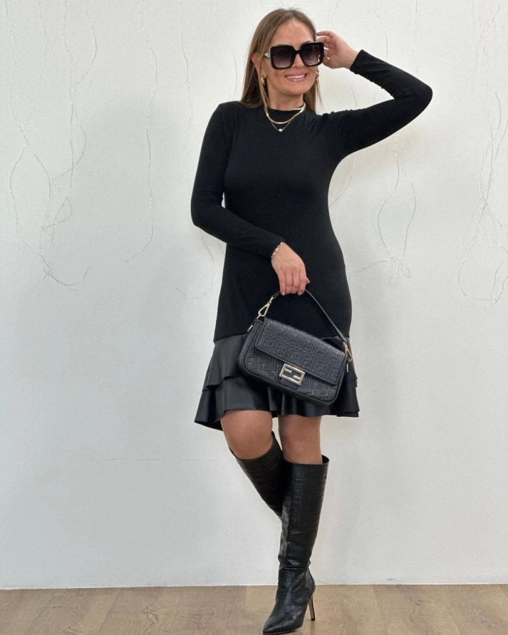 Kadın Uzun Kollu Bisiklet Yaka üst Viskon Etek Ucu Deri Kısa Elbise