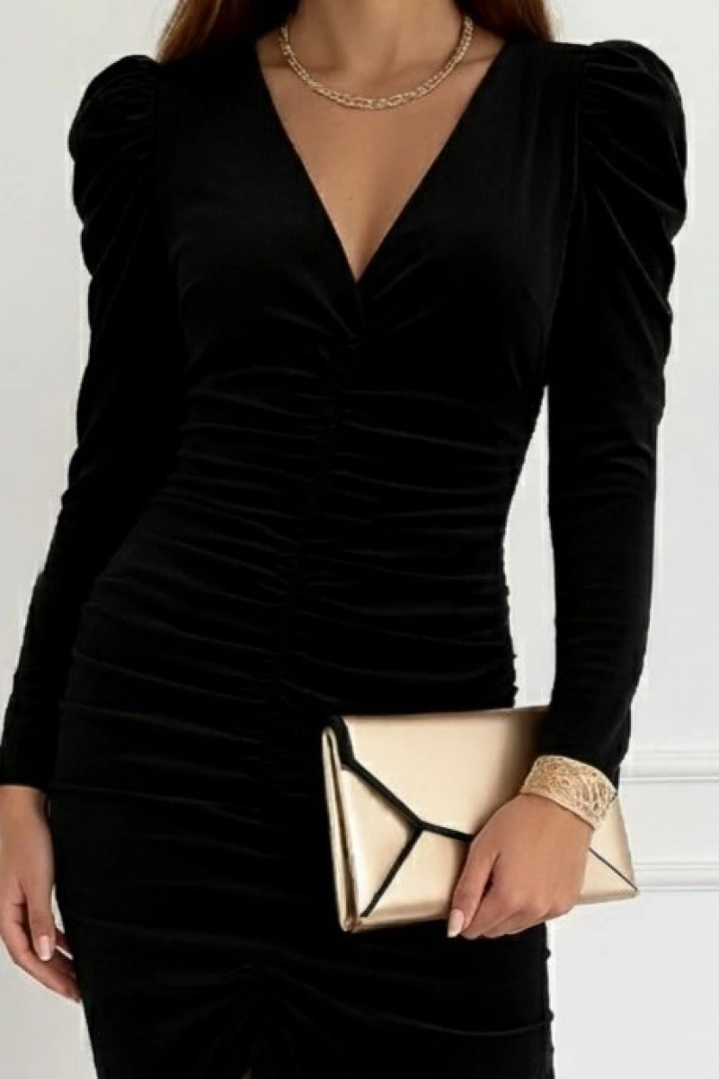Kadın Uzun Kollu V Yakalı Yanlardan Büzgülü Kısa Sandy Elbise