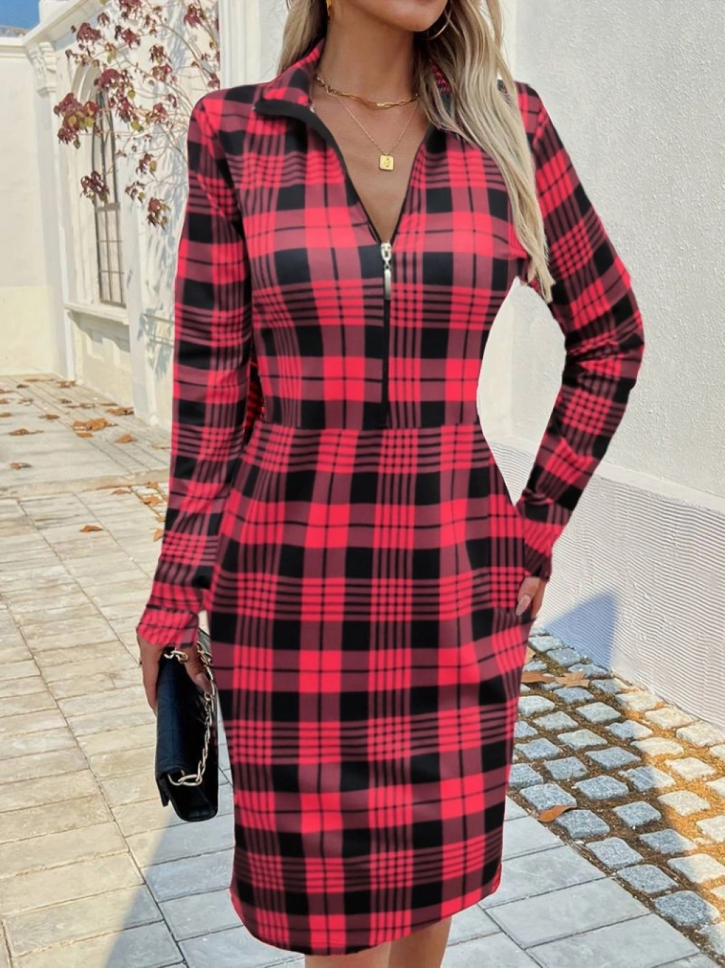 Kadın Uzun Kollu Fermuarlı Ekose Baskılı Dalgıç Elbise