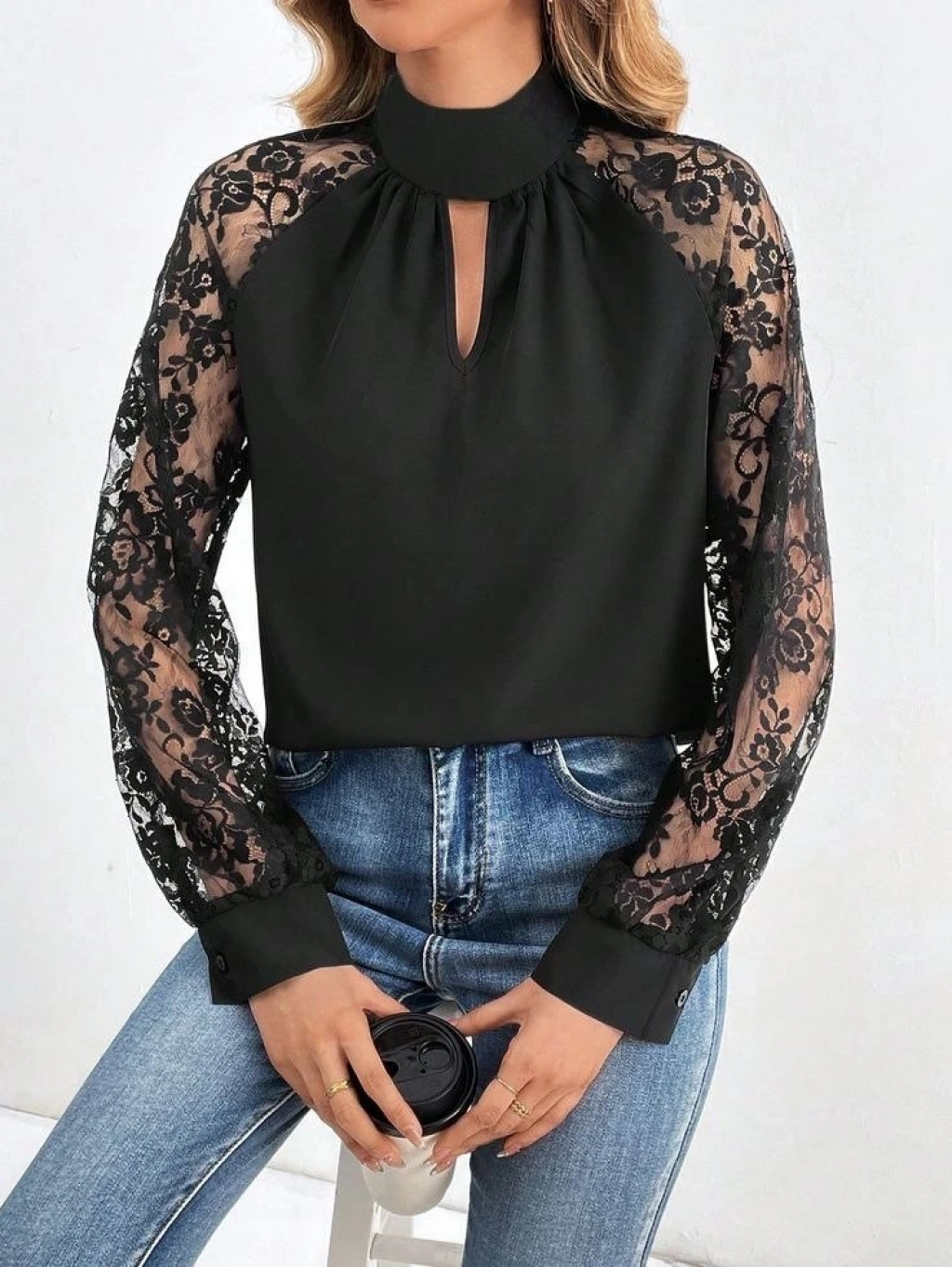 Kadın Uzun Kollu Göğüs Pencere Detay Yaka Boğazlı Kolları Tüllü Sandy Bluz