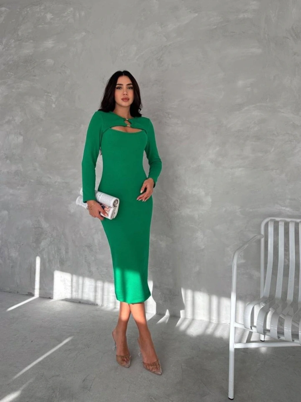 Kadın Uzun Kollu Halka Ve Pencere Dekolte Detay Fırsat ürün Midi Boy Elbise