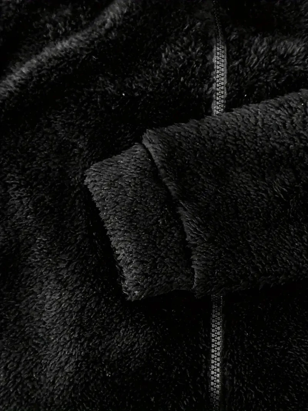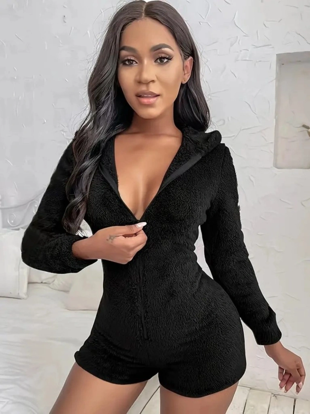 Kadın Uzun Kollu Kapişon Ve Fermuar Detaylı Peluş şort Tulum