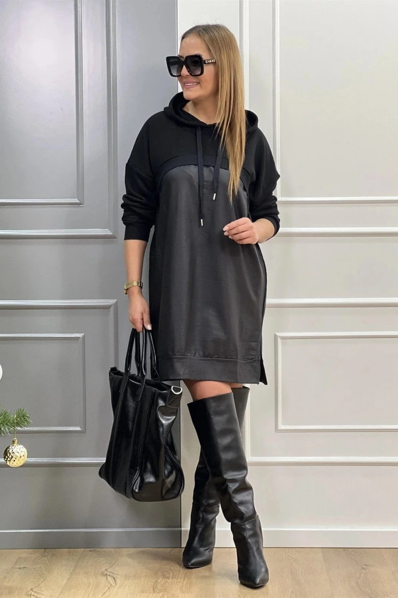 Kadın Uzun Kollu Kapüşon Ve Deri Detay Diz üstü Elbise