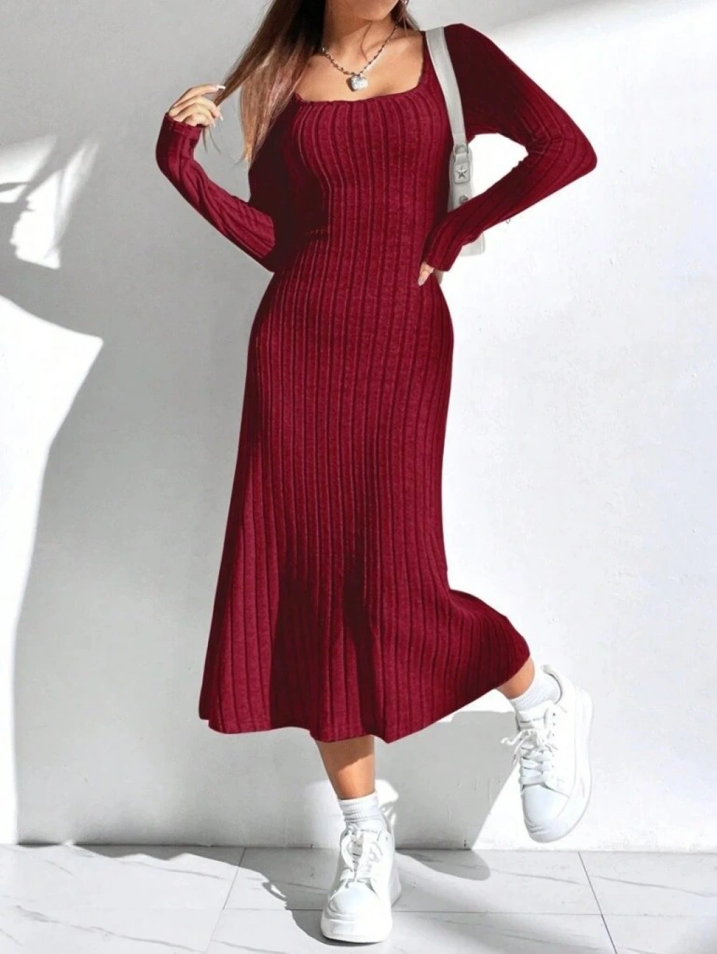 Kadın Uzun Kollu Kare Yaka Midi Kaşkorse Elbise