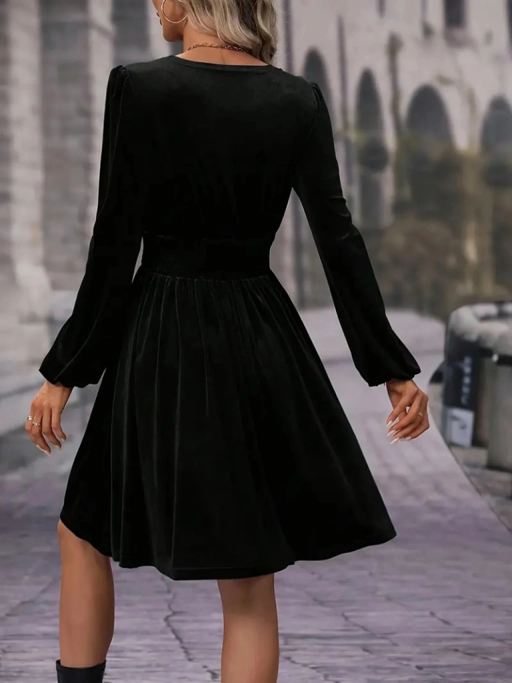 Kadın Uzun Kollu Kruvaze Yaka Beli Lastikli Kiloş Kadife Elbise