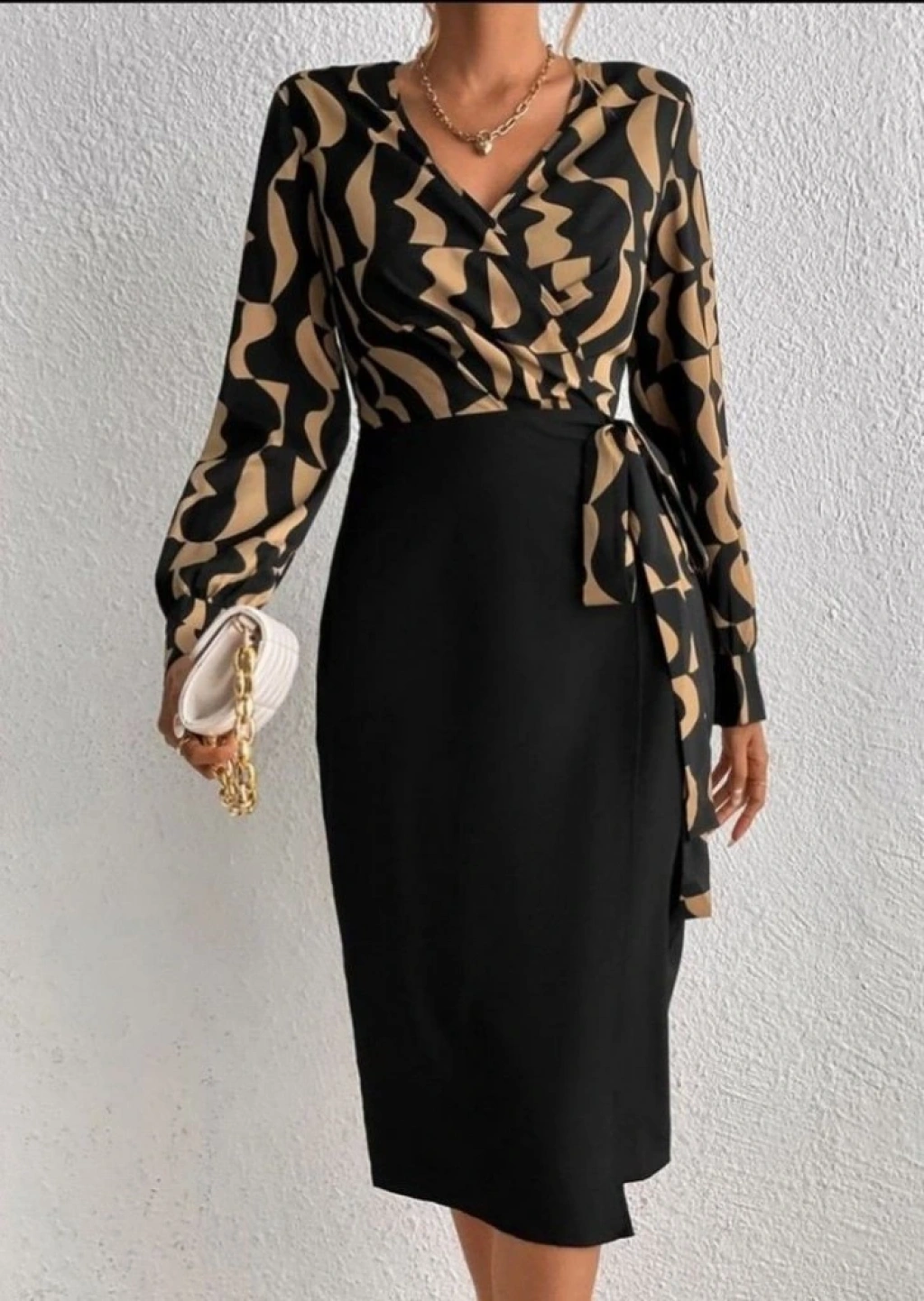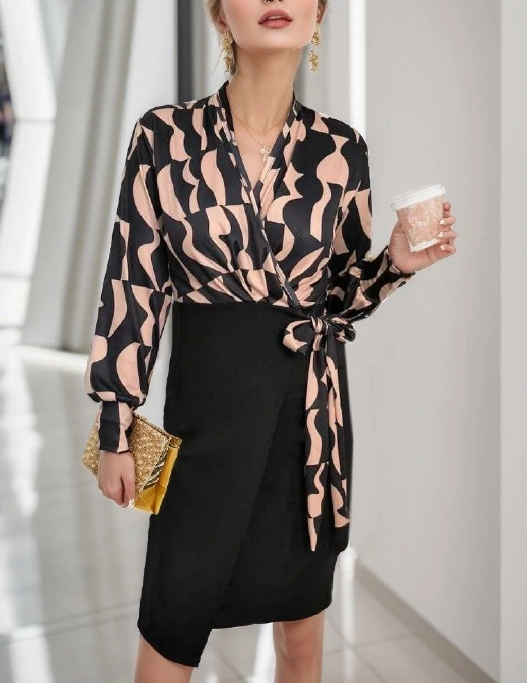 Kadın Uzun Kollu Kruvaze Yaka Dijital Baskılı Fiyonk Detay Atlas Kumaş Elbise