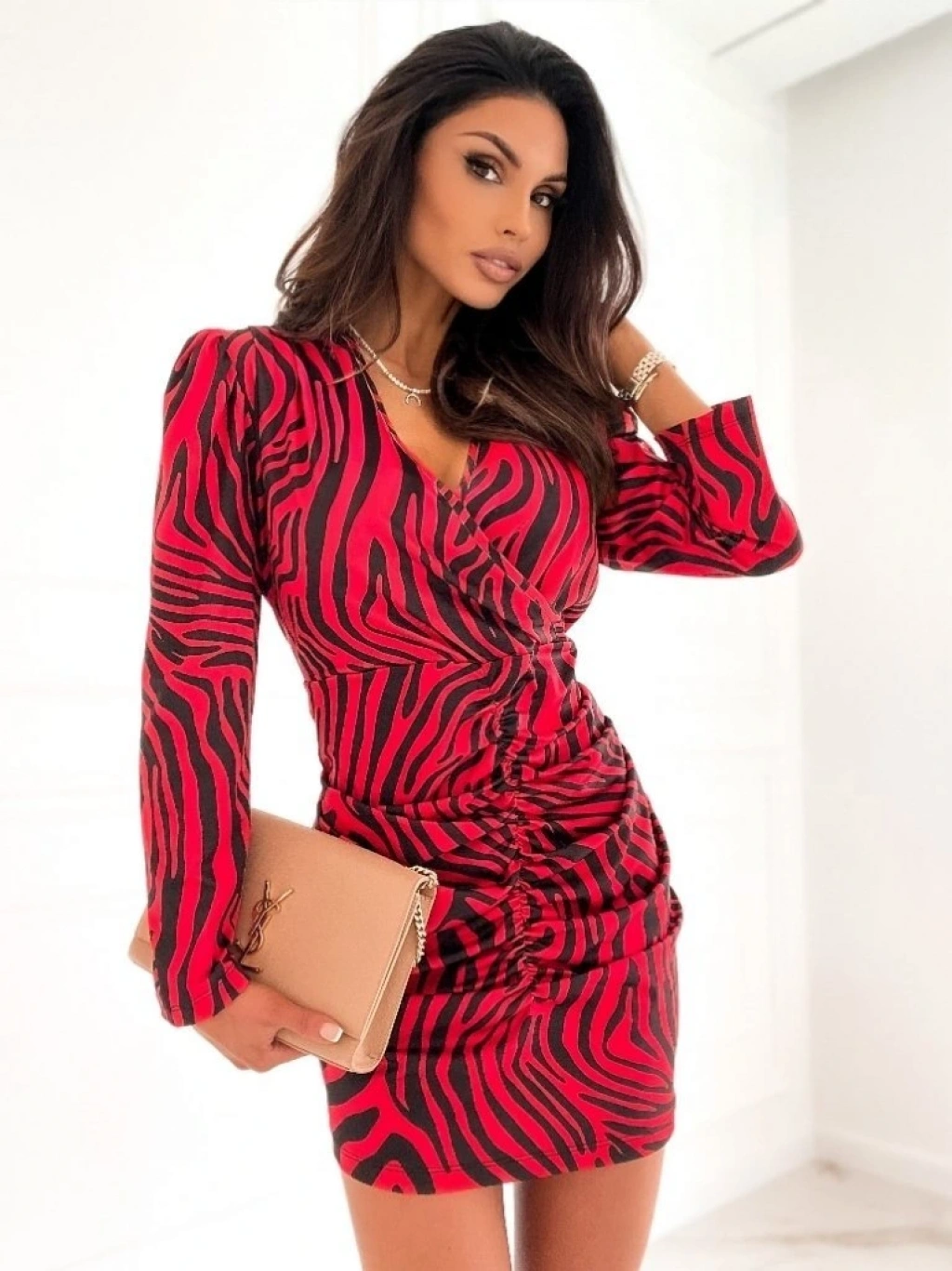 Kadın Uzun Kollu Kruvaze Yaka ön Kısım Büzgülü Dalgıç Mini Boy Elbise
