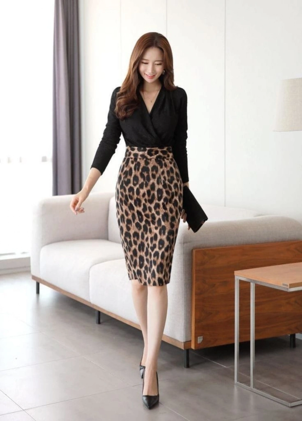 Kadın Uzun Kollu Kruvaze Yaka üst Ithal Krep Alt Dalgıç Leopar Detaylı Elbise