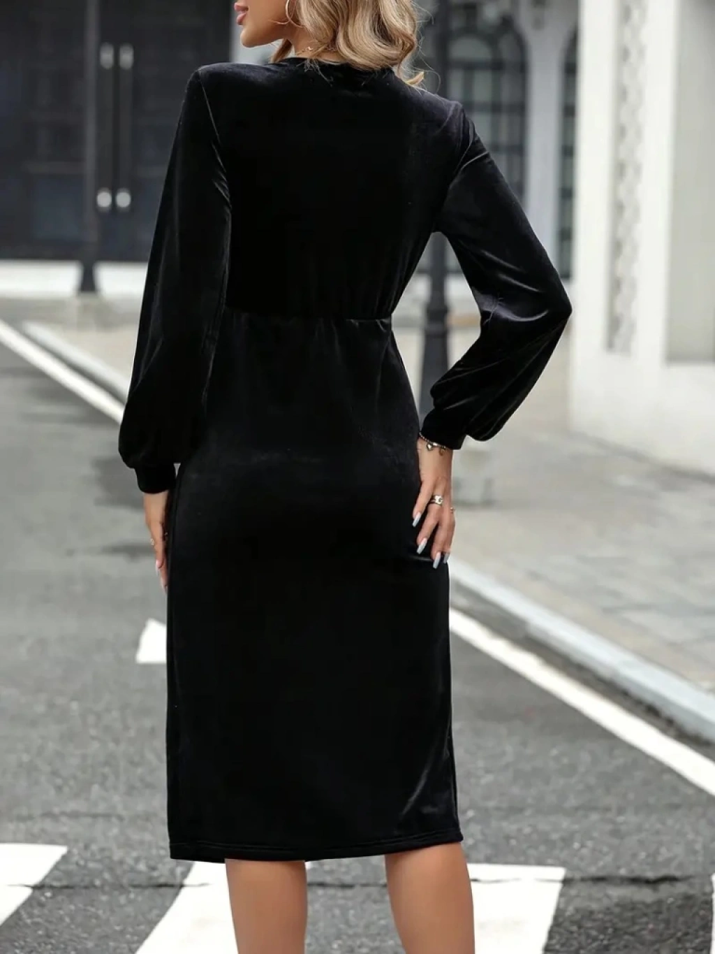 Kadın Uzun Kollu Kruvaze Yaka Yanlardan Büzgü Detaylı Yırtmaçlı Kadife Elbise