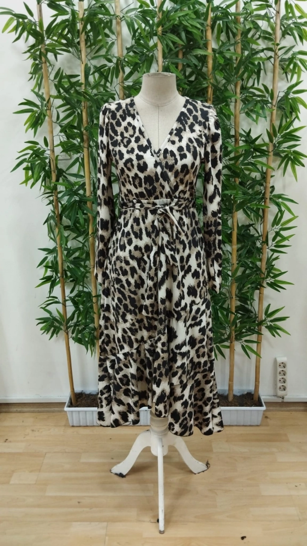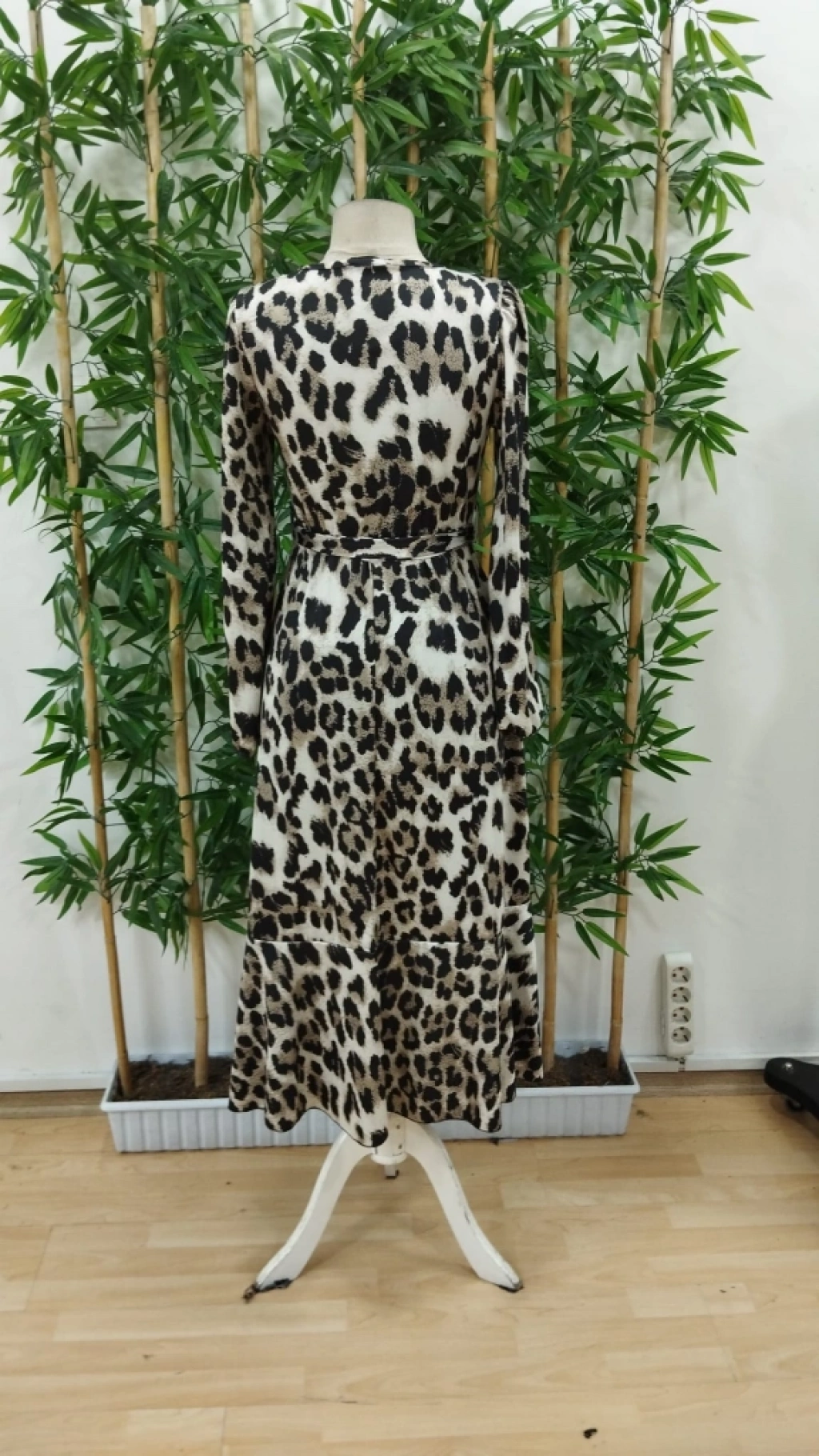 Kadın Uzun Kollu Kruvaze Yakalı Belden Kuşaklı Leopar