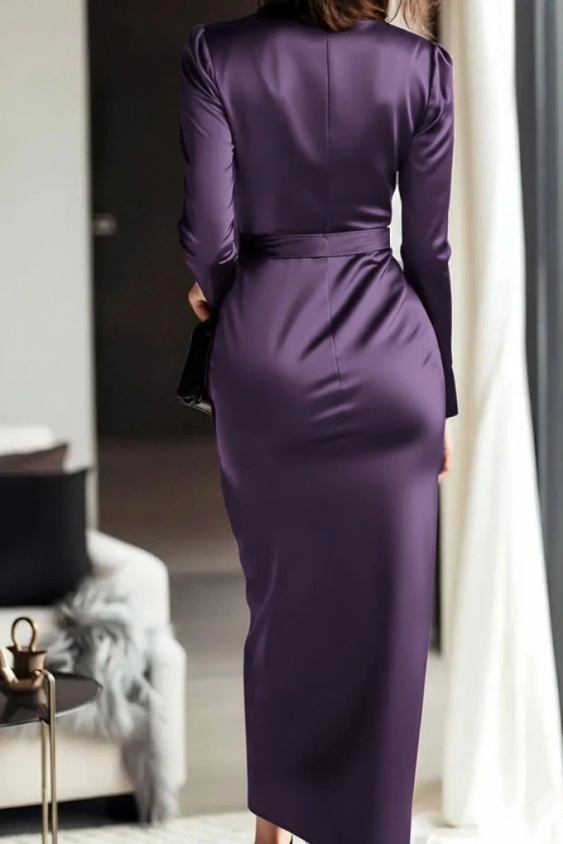 Kadın Uzun Kollu Kruvaze Yakalı Beli Kuşaklı Uzun Saten Elbise