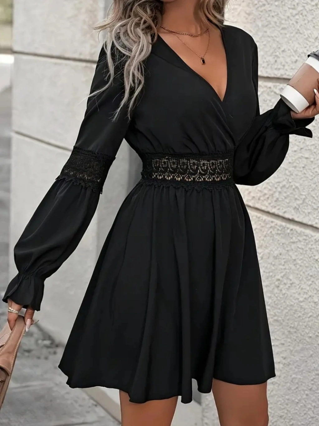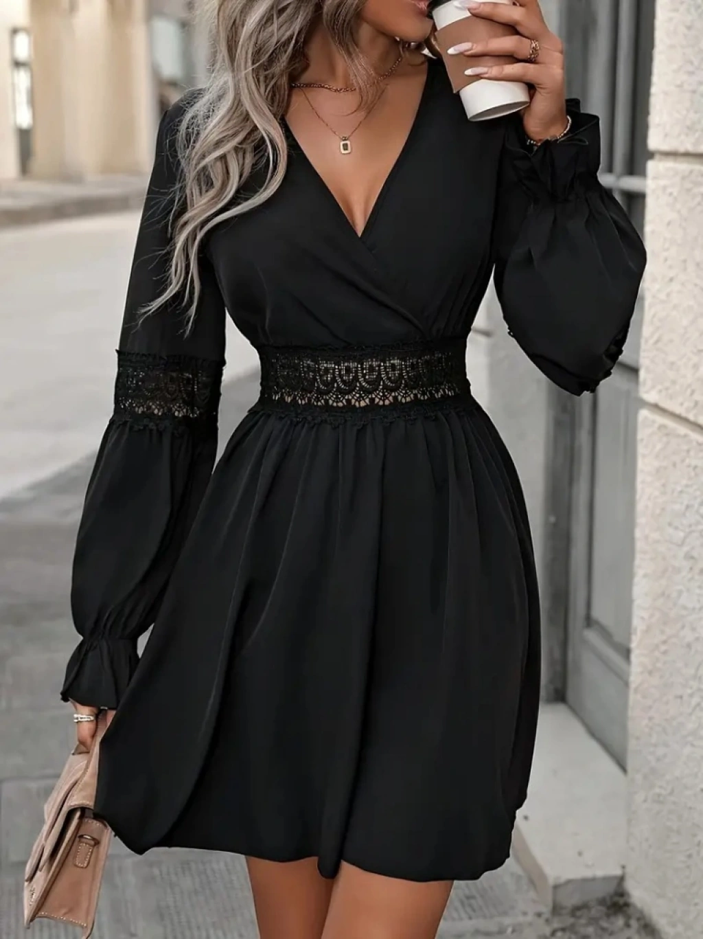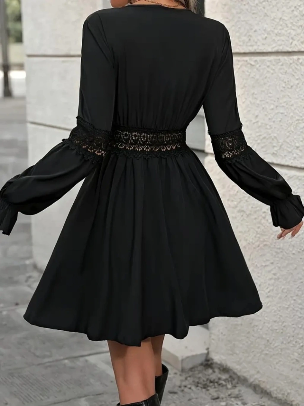 Kadın Uzun Kollu Kruvaze Yakalı Dantelli Fermuar Detaylı Kısa Ithal Krep Elbise