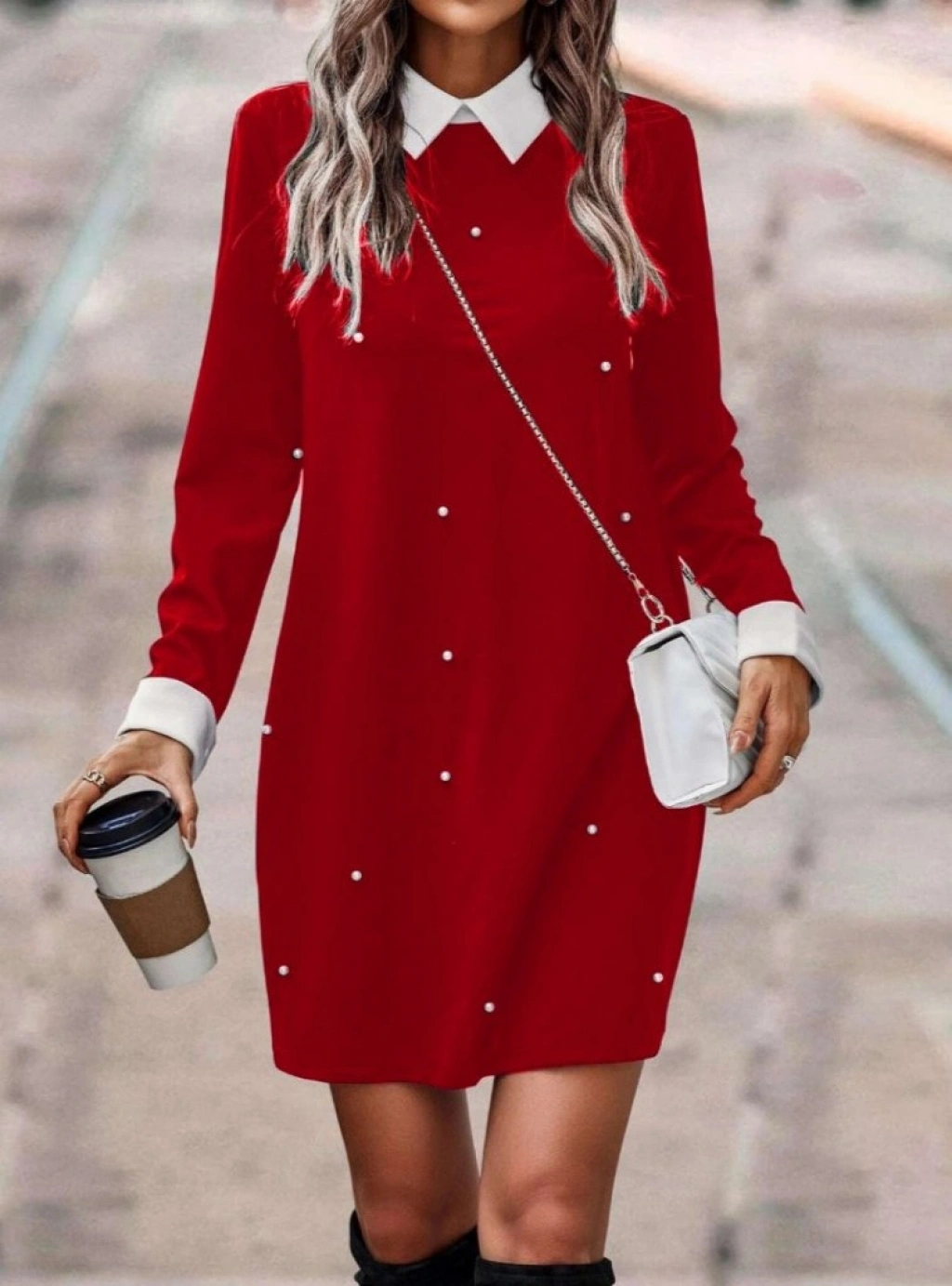 Kadın Uzun Kollu Polo Yaka Inci Detay Krep Elbise