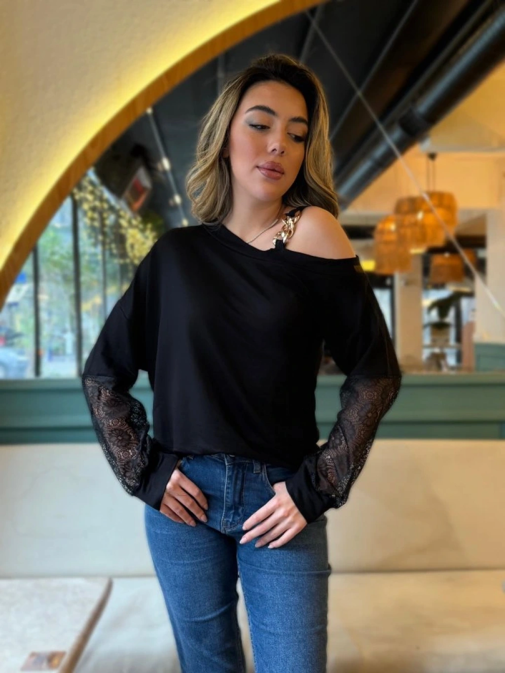Kadın Uzun Kollu Tek Omuzu Açık Askılı Toka Ve Dantel Detay Viskon Iki Iplik Bluz