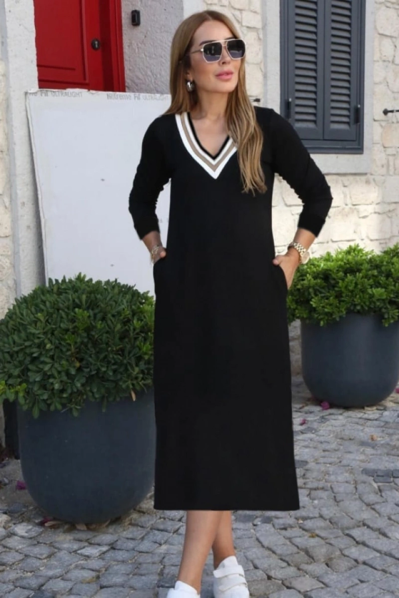 Kadın Uzun Kollu V şerit Yakalı Viskon Iki Iplik Elbise
