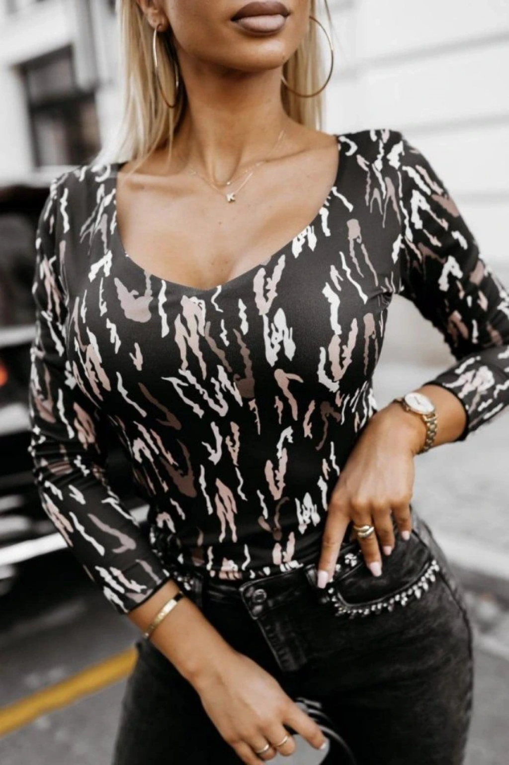 Kadın Uzun Kollu V Yaka Desenli Mikro Kumaş Bluz