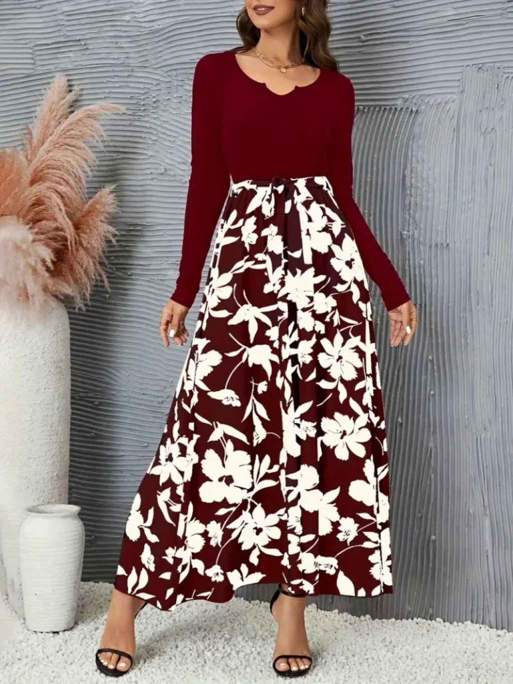 Kadın Uzun Kollu Yaka Açık üst Kaşkorse Beli Kuşaklı Alt çiçek Baskılı Dalgıç Elbise