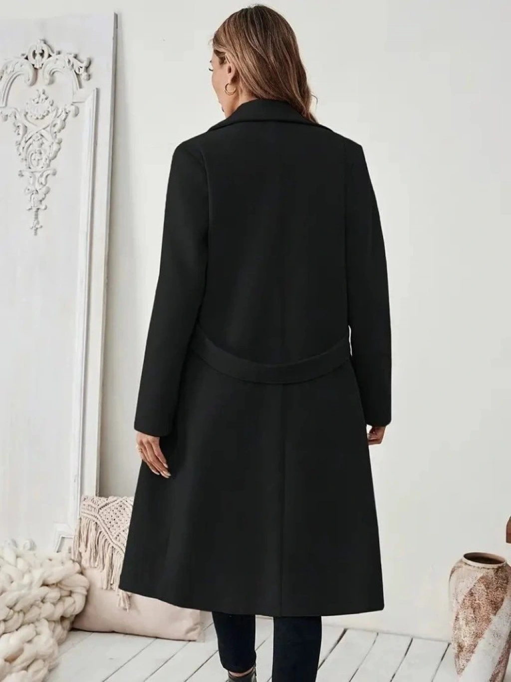 Kadın Uzun Kollu Yakalı Belde şerit Düğme Detaylı Cepli Mini Kaşe Kaban