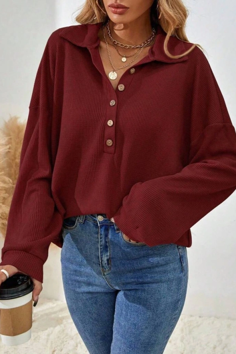 Kadın Uzun Kollu Yakalı Düğmeli Salaş Waffle Bluz