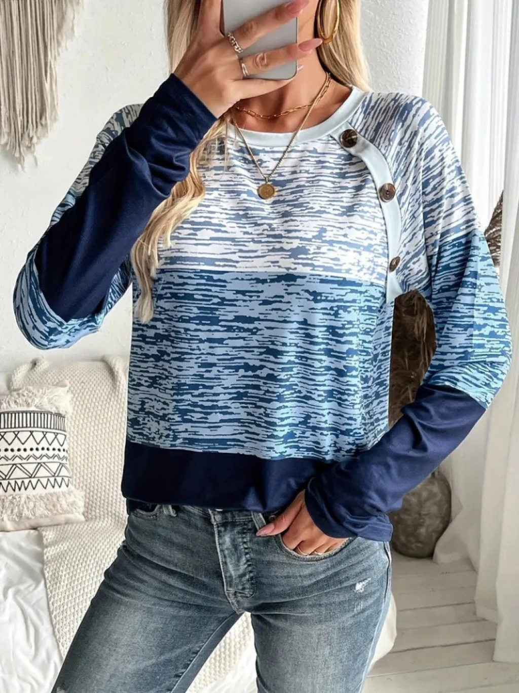 Kadın Uzun Kollu Yuvarlak Yaka Baskılı Düğme Detay Süprem Bluz
