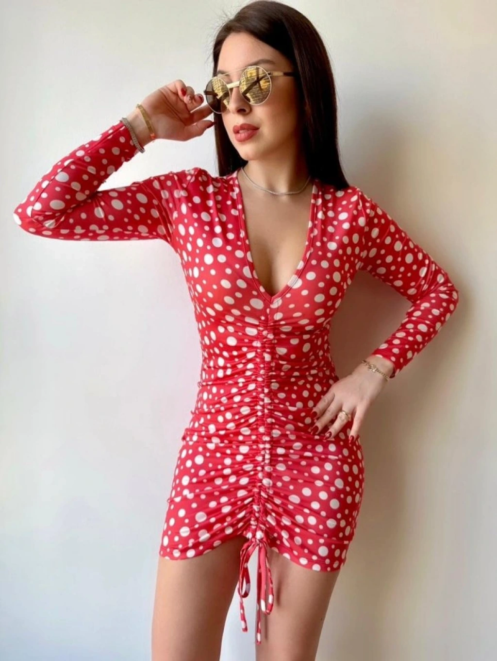 Kadın V Yaka önü Asansör Büzgü Detay Fırsat ürün Puantiyeli Mini Elbise
