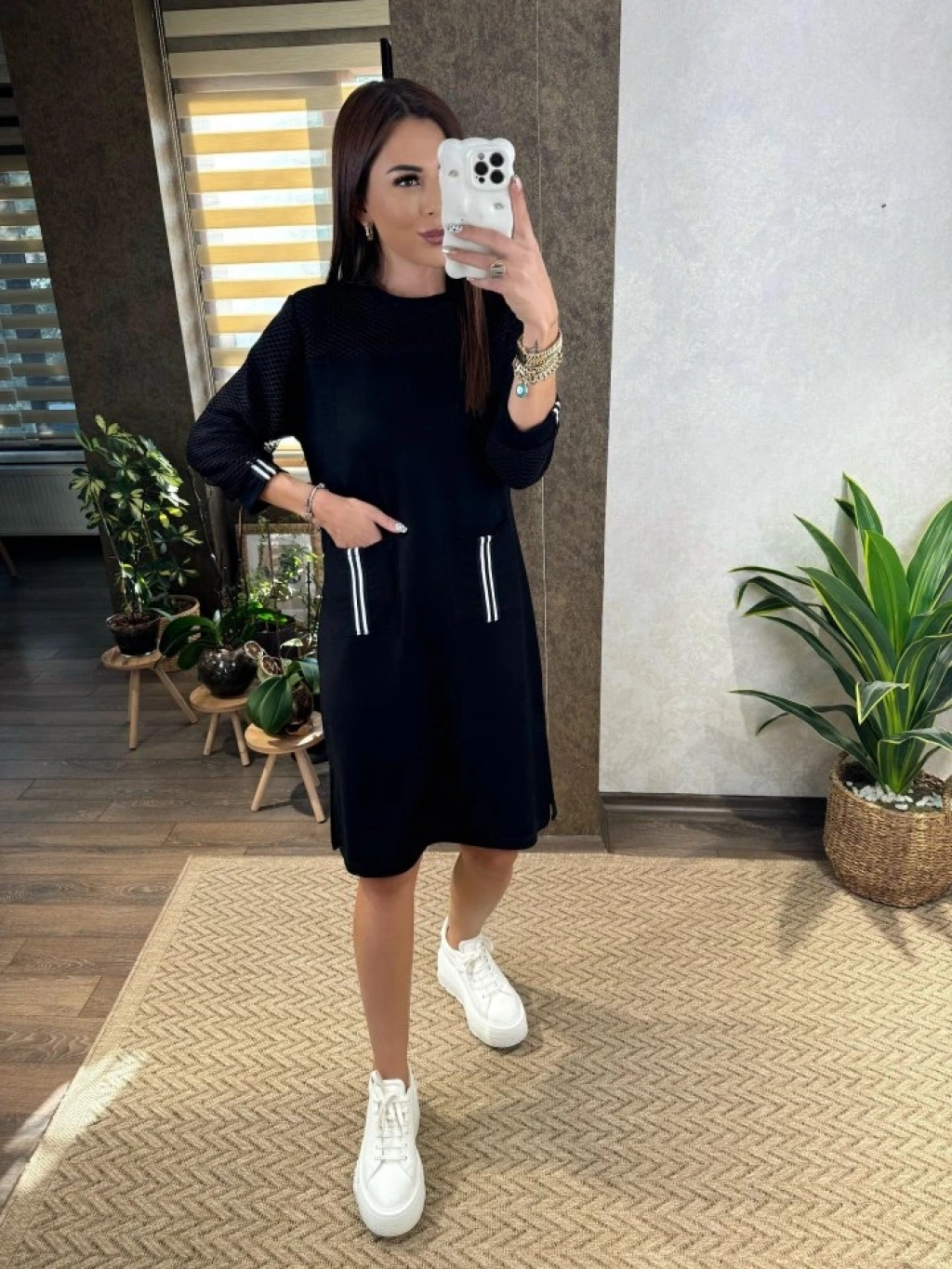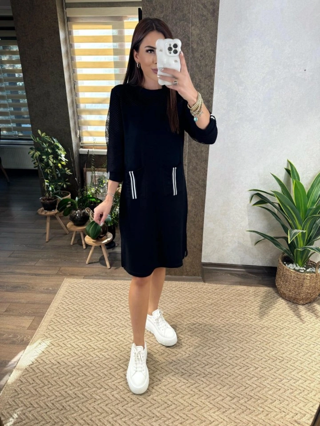 Kadın Viskon Pamuklu Kumaş Kol File , şerit Ve Cep Detaylı Elbise