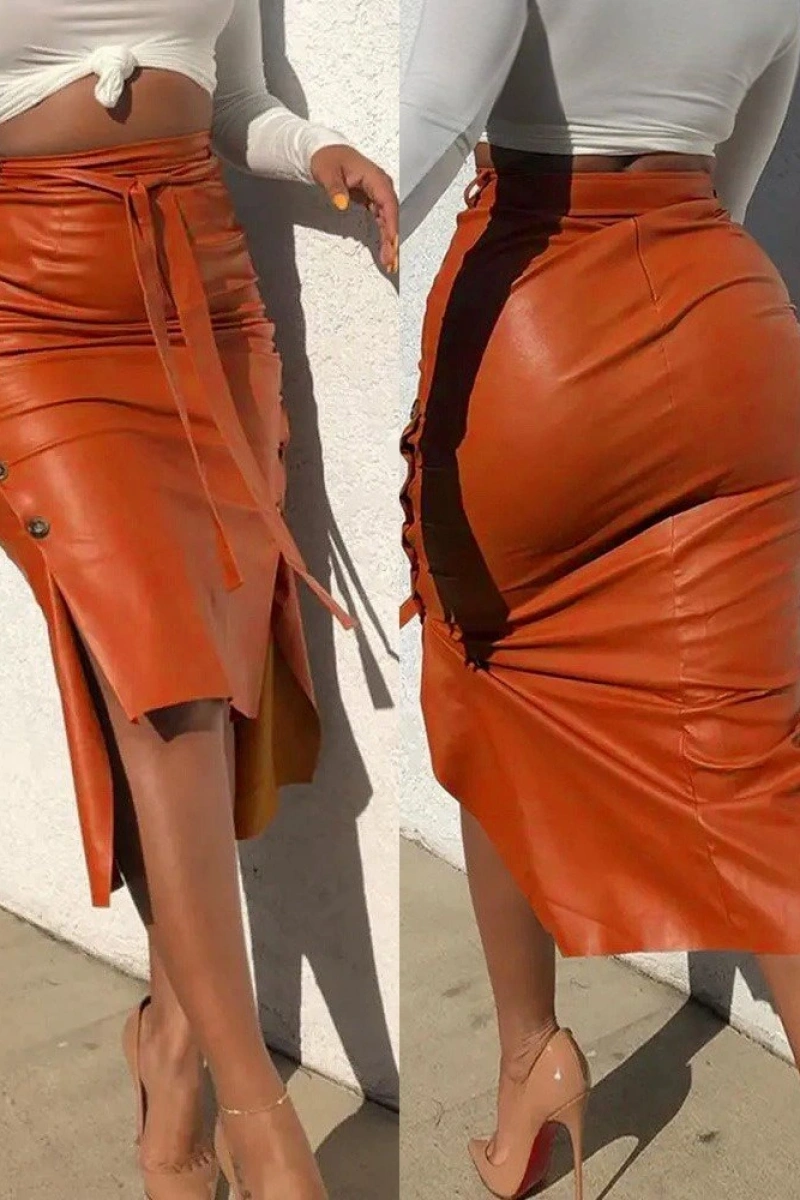 Kadın Yüksek Bel Kuşaklı Yanlardan Düğmeli Mini Deri Etek