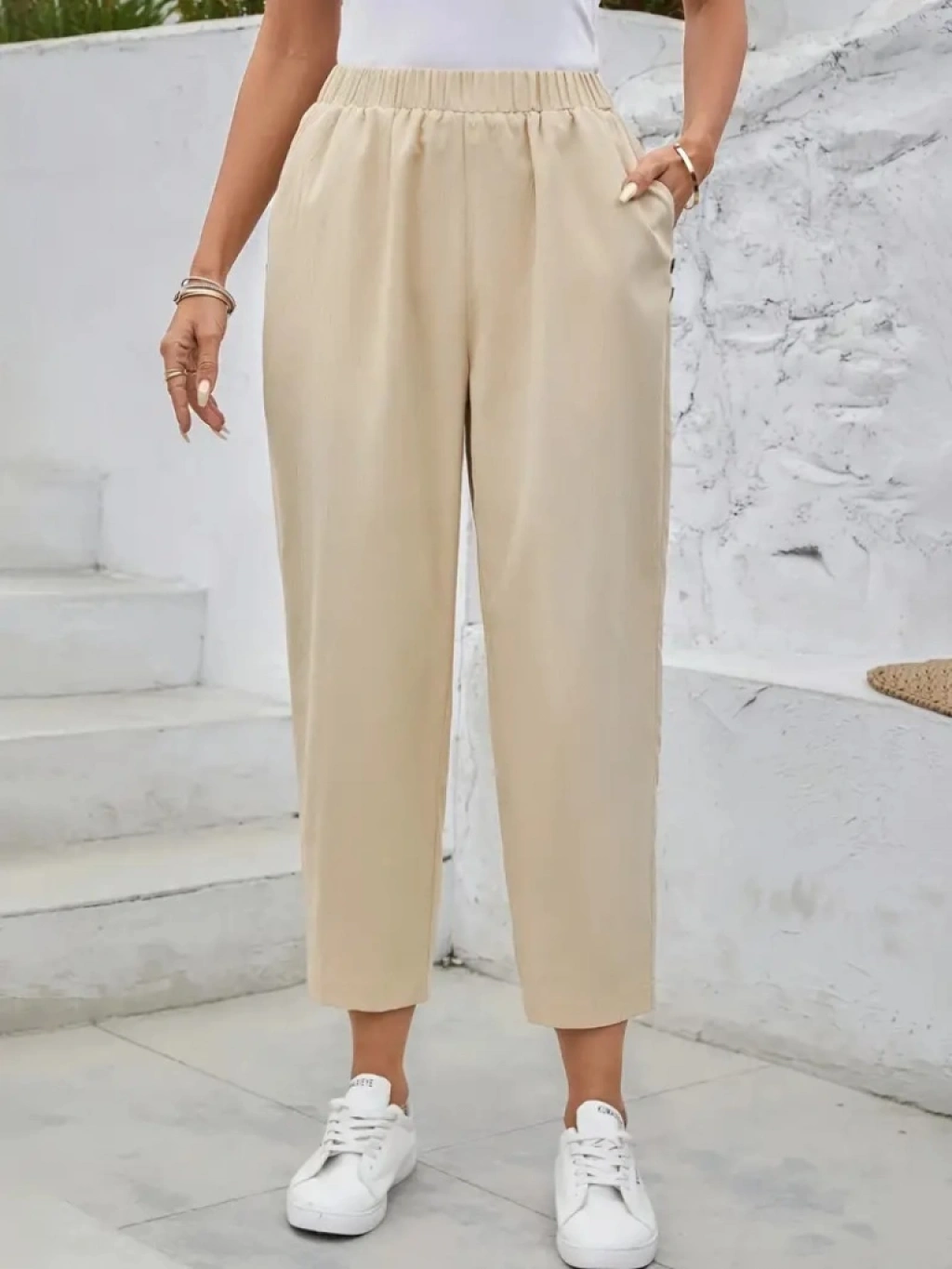 Kadın Yüksek Bel Yandan Cepli Düğme Detaylı Geniş Kesim Ithal Krep Pantolon