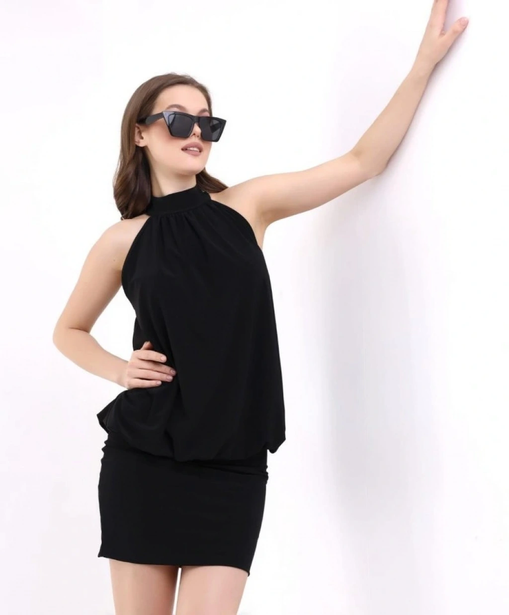 Kadın Yüksek Yaka Büzgü Detaylı Şifon Garnili Sandy Kumaş Fırsat Ürün Diz Üstü Elbise